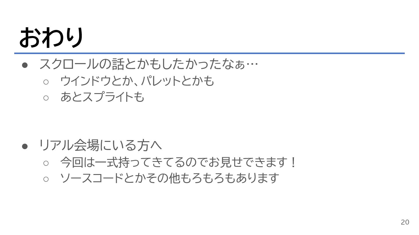 おわり • スクロールの話とかもしたかったなぁ… ◦ ウインドウとか、パレットとかも ◦ あとスプライトも • リアル会場にいる方へ ◦