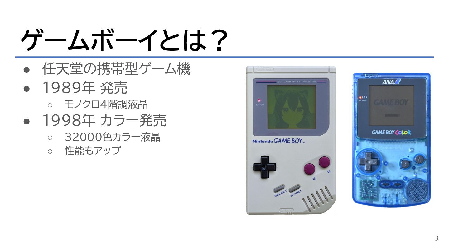 ゲームボーイとは? • 任天堂の携帯型ゲーム機 • 1989年 発売 ◦ モノクロ4階調液晶 • 1998年