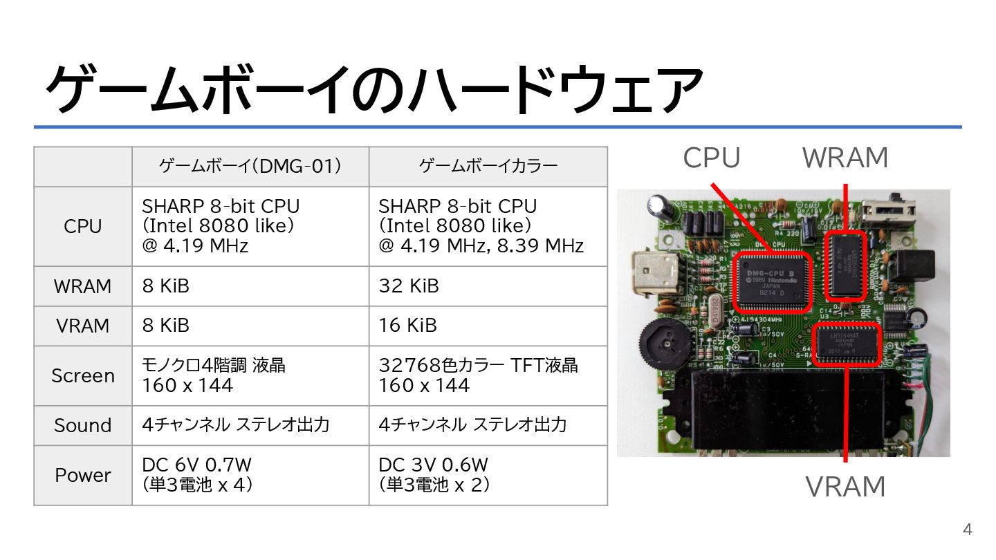 ゲームボーイのハードウェア 4 ゲームボーイ(DMG-01) ゲームボーイカラー CPU SHARP 8-bit CPU (Intel 8080