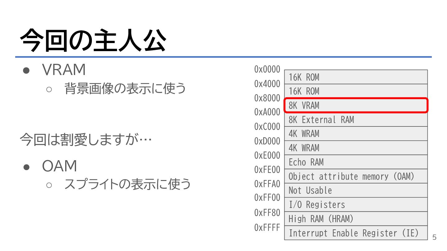 • VRAM ◦ 背景画像の表示に使う 今回は割愛しますが… • OAM ◦ スプライトの表示に使う 今回の主人公
