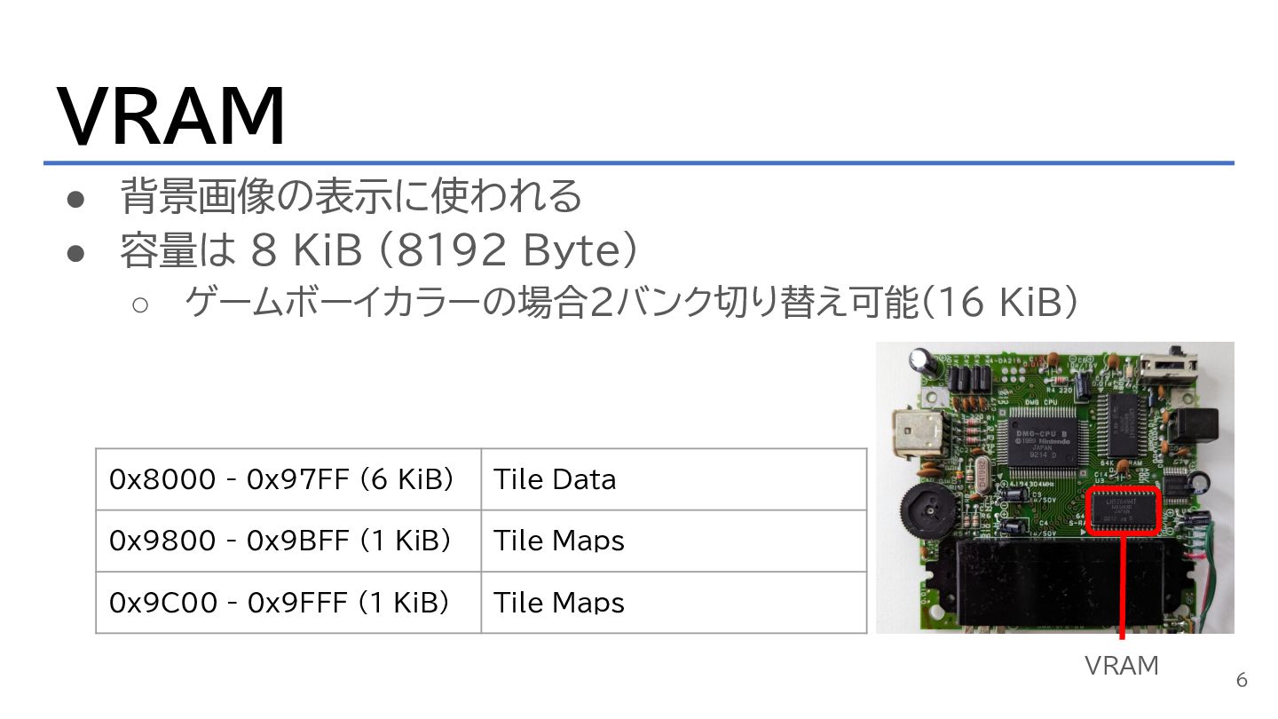 • 背景画像の表示に使われる • 容量は 8 KiB (8192 Byte) ◦ ゲームボーイカラーの場合2バンク切り替え可能(16