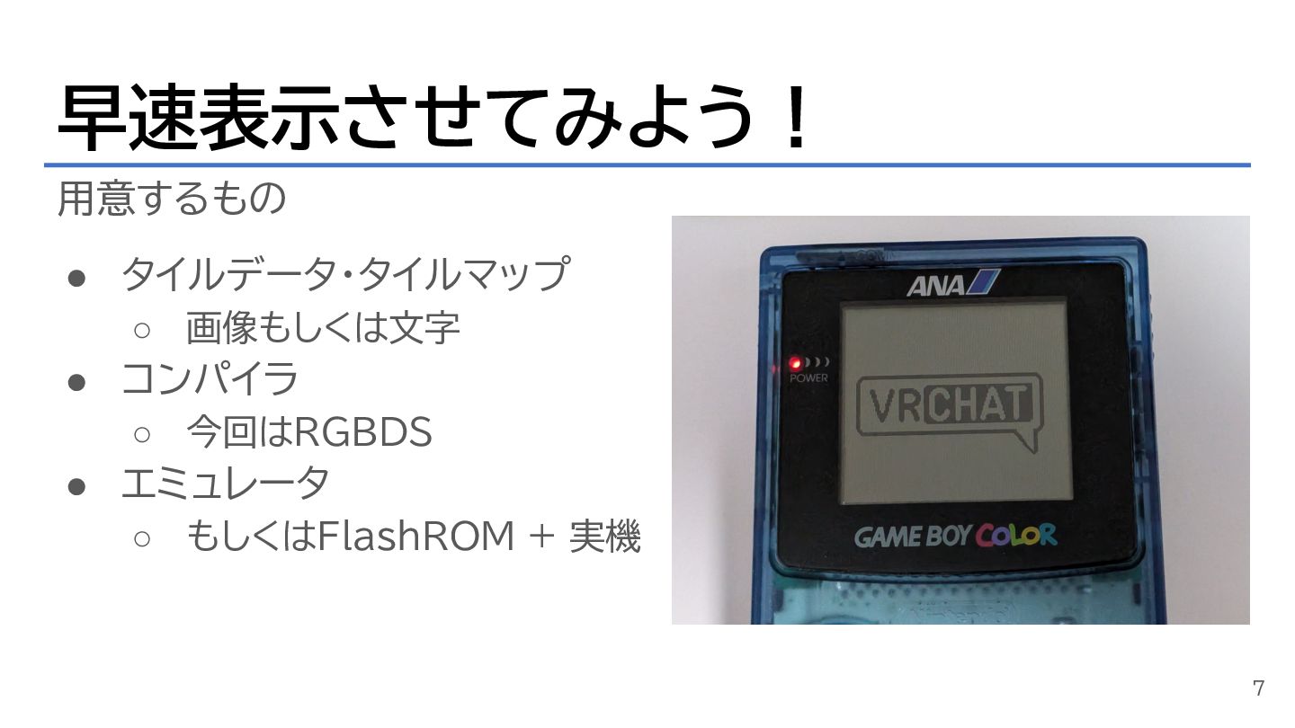 早速表示させてみよう! 用意するもの • タイルデータ・タイルマップ ◦ 画像もしくは文字 • コンパイラ ◦ 今回はRGBDS