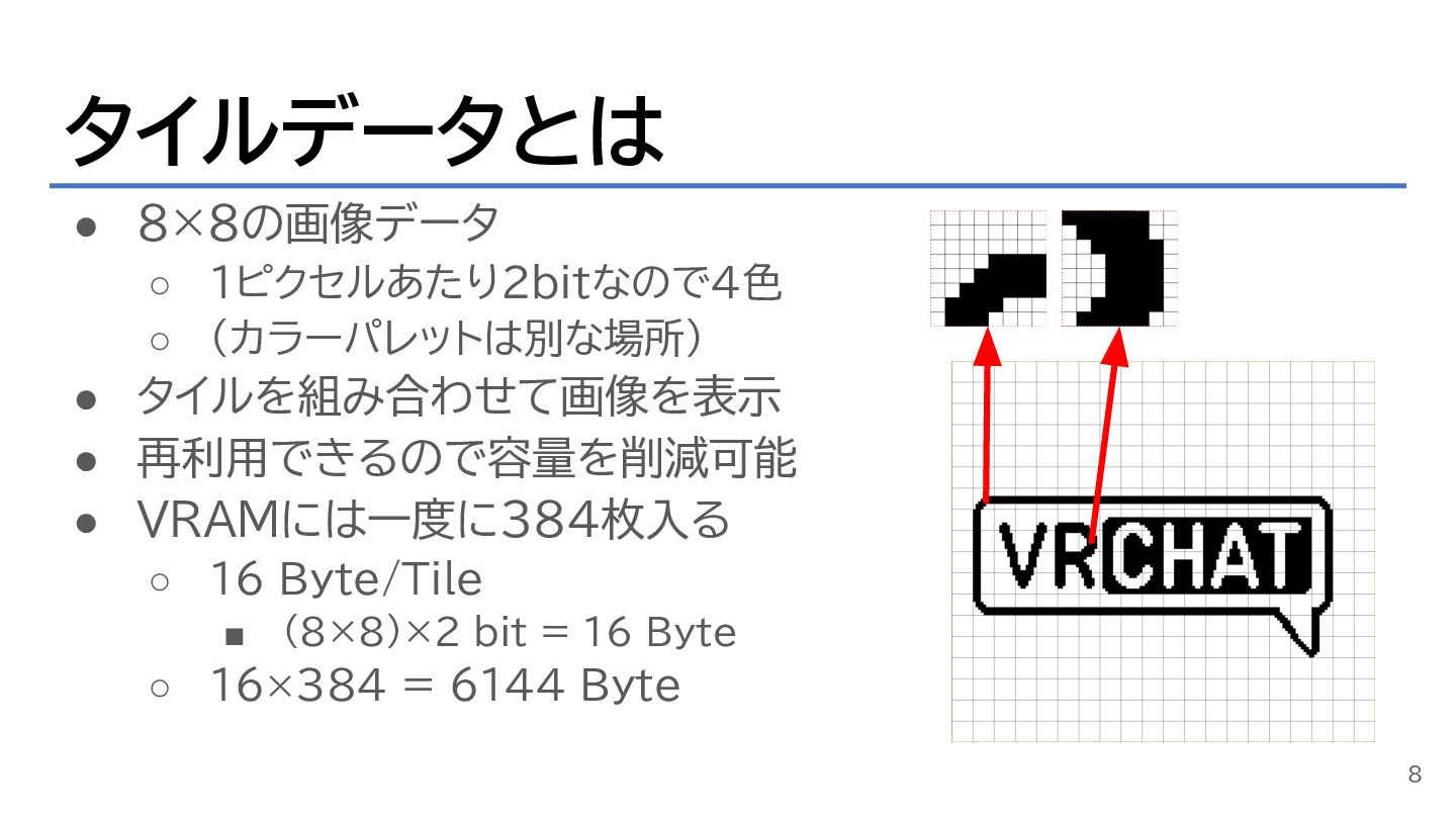 再利用できるので容量を削減可能 • VRAMには一度に384枚入る ◦ 16 Byte/Tile ▪ (8×8)×2 bit = 16 Byte ◦ 16×384 = 6144 Byte 8