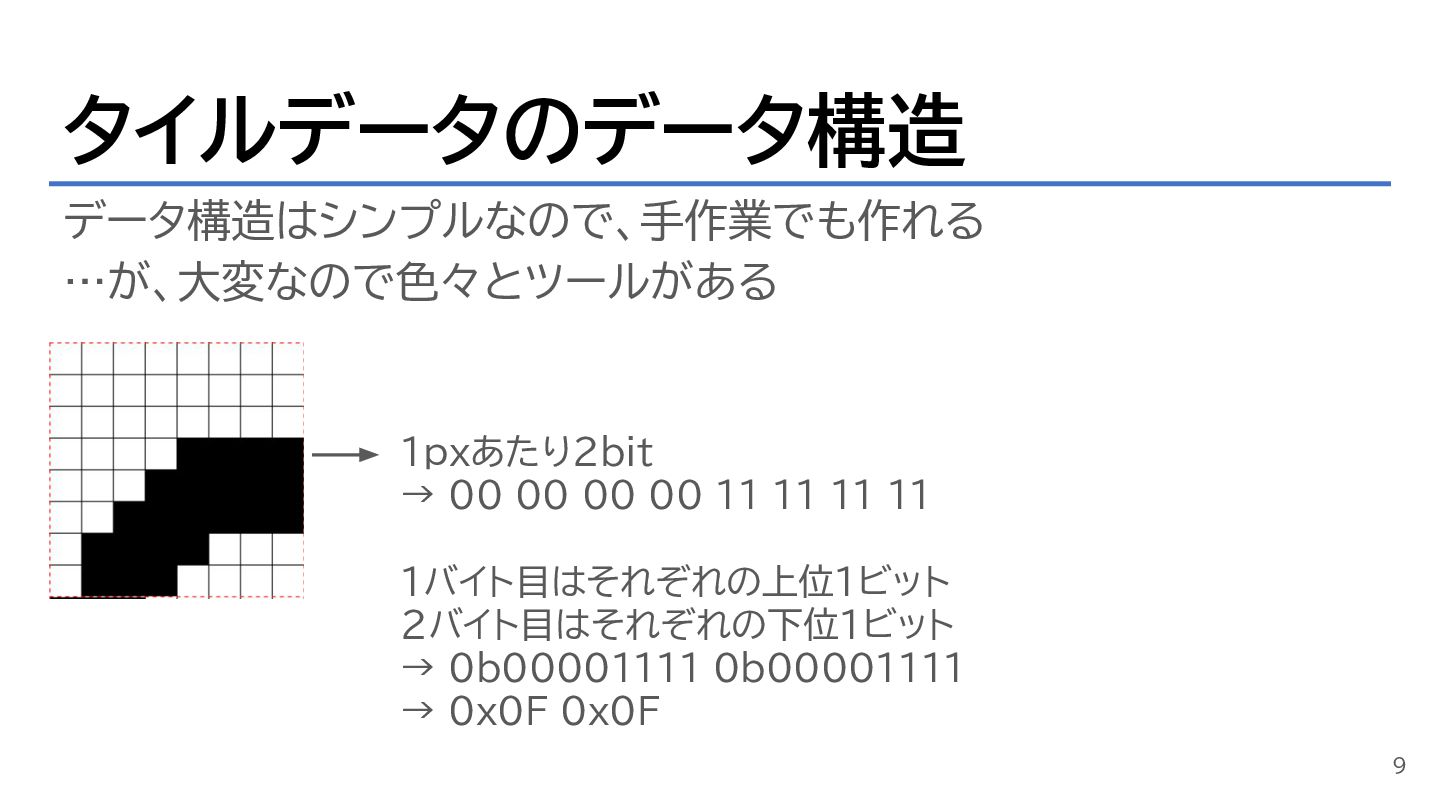 タイルデータのデータ構造 データ構造はシンプルなので、手作業でも作れる …が、大変なので色々とツールがある 9 1pxあたり2bit → 00 00 00 00