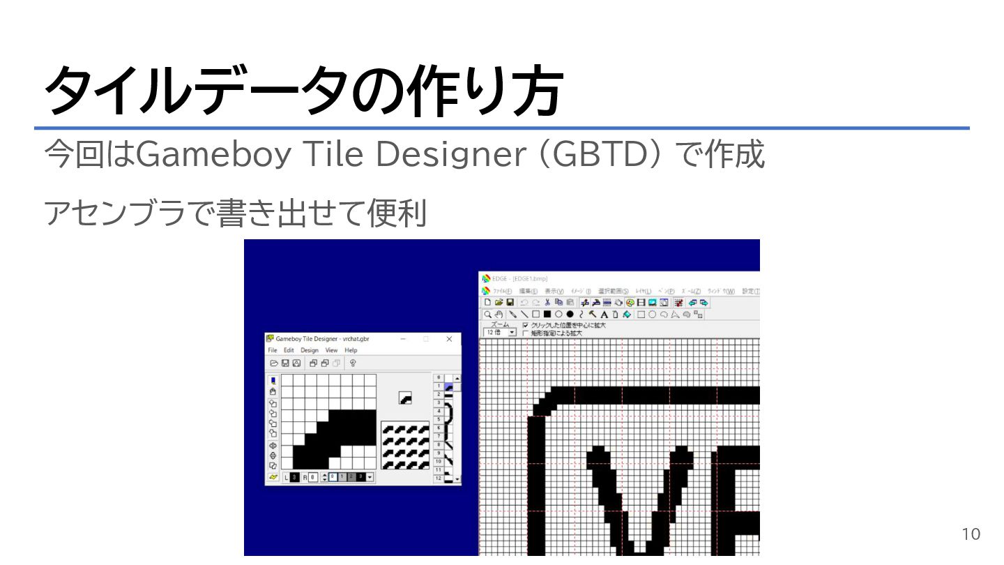 タイルデータの作り方 今回はGameboy Tile Designer (GBTD) で作成 アセンブラで書き出せて便利 10
