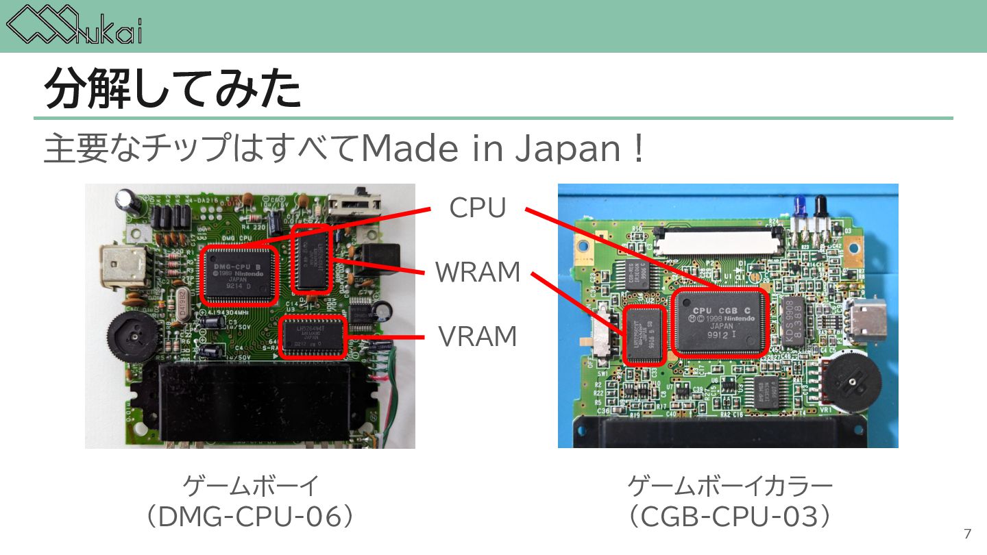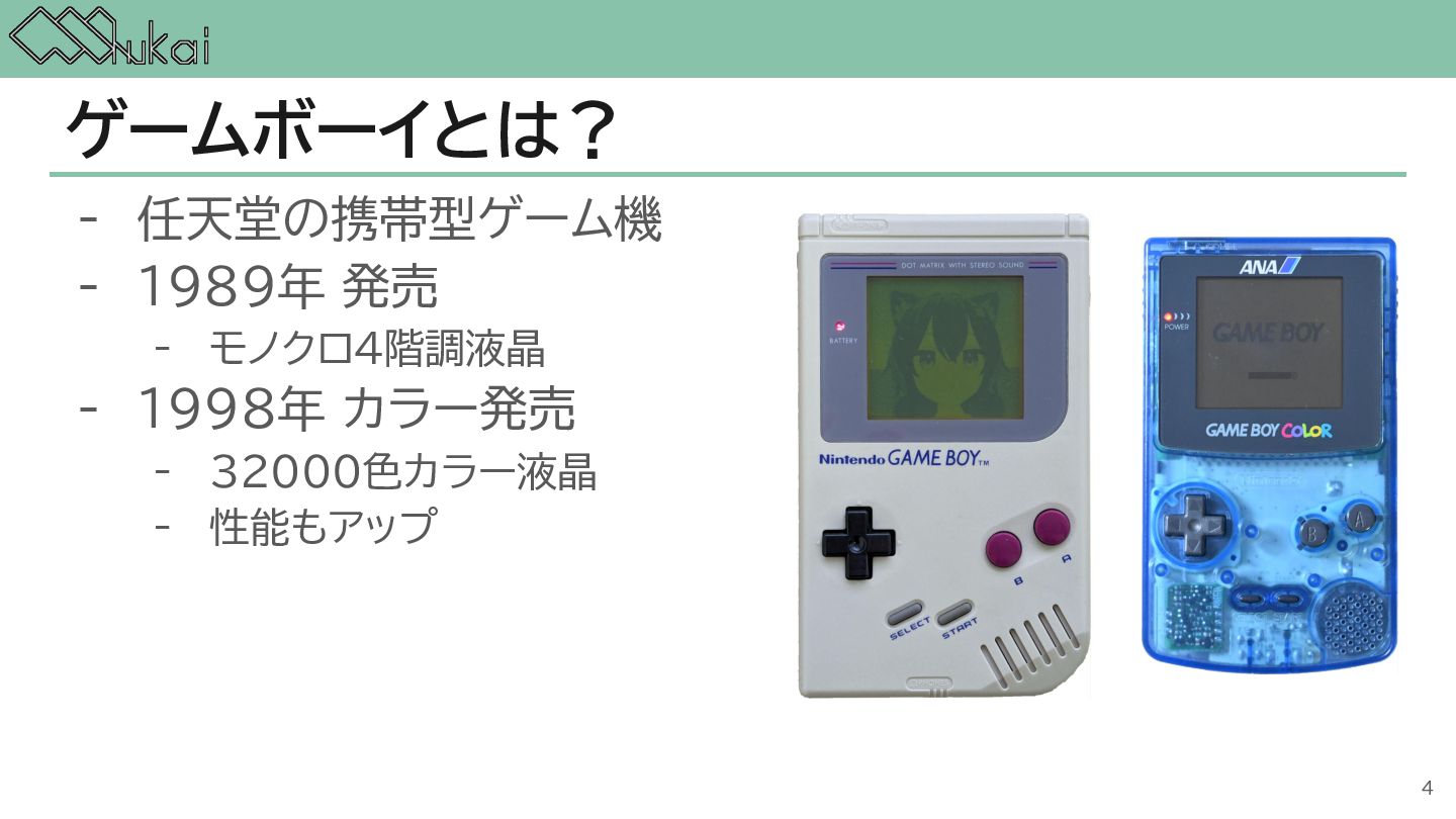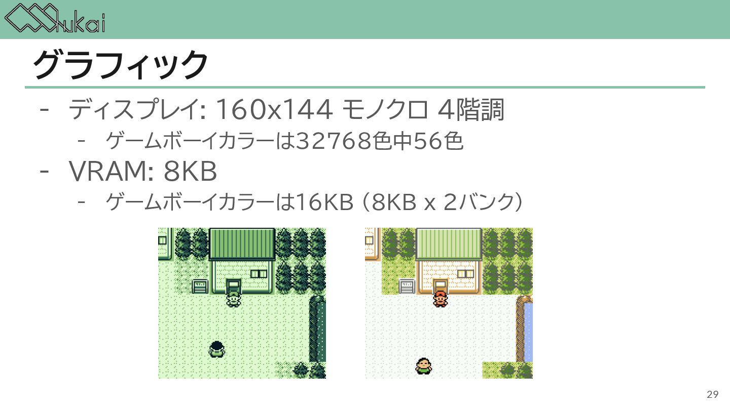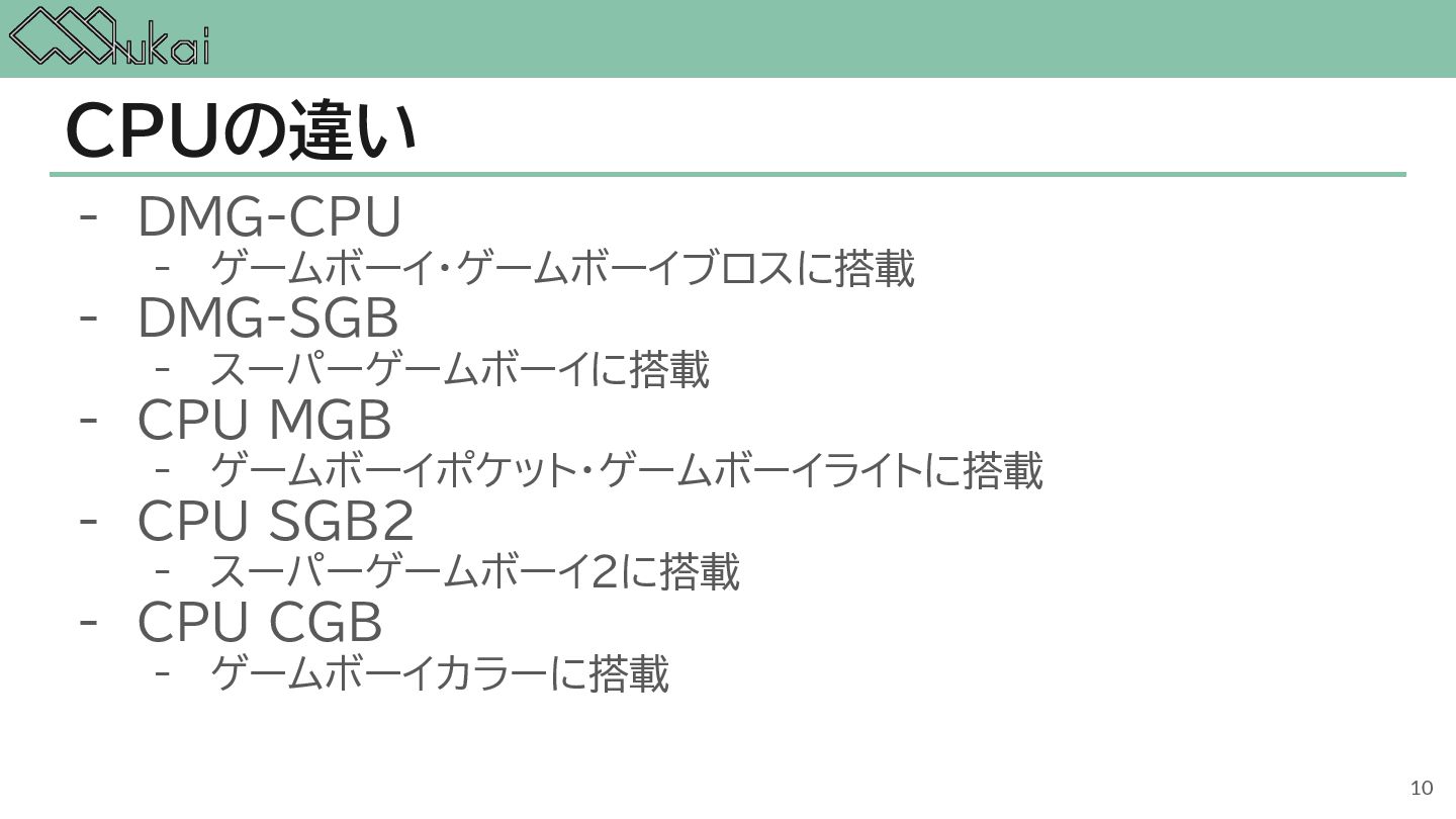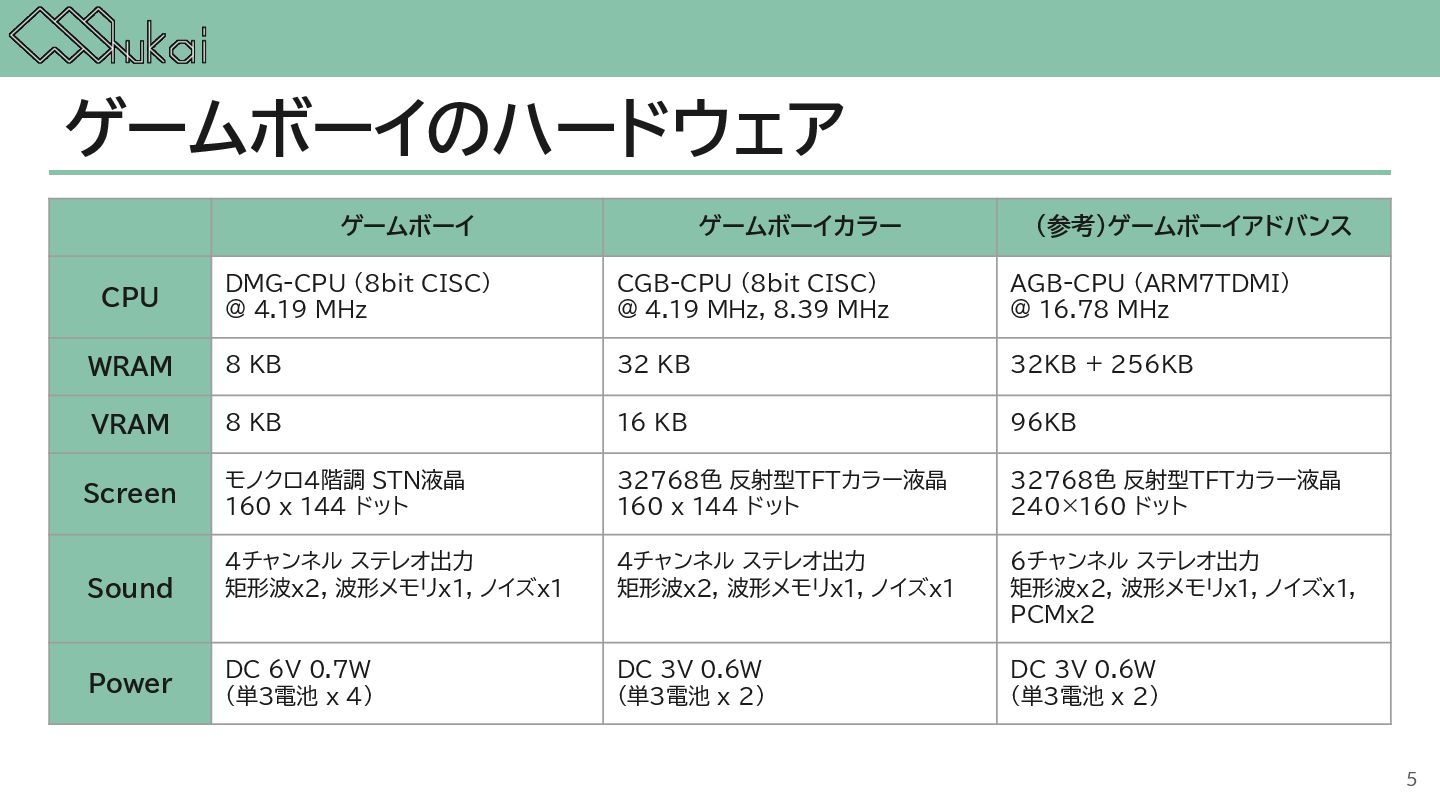 MHz CGB-CPU (8bit CISC) @ 4.19 MHz, 8.39 MHz AGB-CPU (ARM7TDMI) @ 16.78 MHz WRAM 8 KB 32 KB 32KB + 256KB VRAM 8 KB 16 KB 96KB Screen モノクロ4階調 STN液晶 160 x 144 ドット 32768色 反射型TFTカラー液晶 160 x 144 ドット 32768色 反射型TFTカラー液晶 240×160 ドット Sound 4チャンネル ステレオ出力 矩形波x2, 波形メモリx1, ノイズx1 4チャンネル ステレオ出力 矩形波x2, 波形メモリx1, ノイズx1 6チャンネル ステレオ出力 矩形波x2, 波形メモリx1, ノイズx1, PCMx2 Power DC 6V 0.7W (単3電池 x 4) DC 3V 0.6W (単3電池 x 2) DC 3V 0.6W (単3電池 x 2) 5