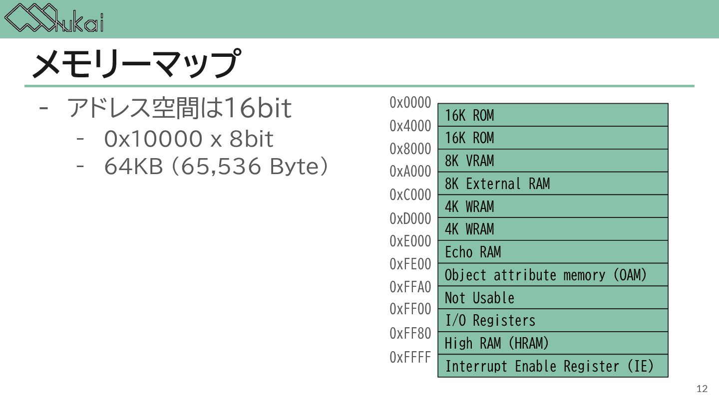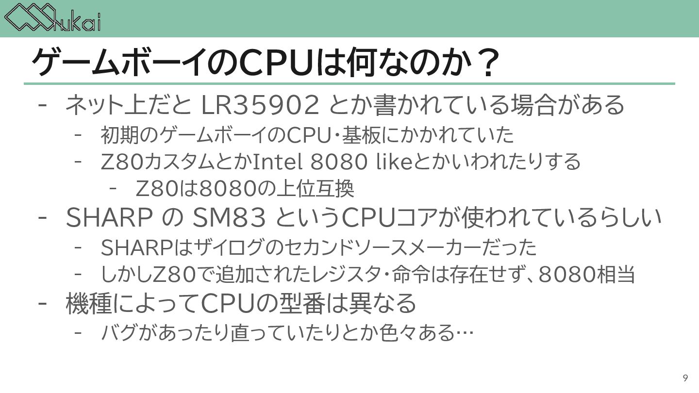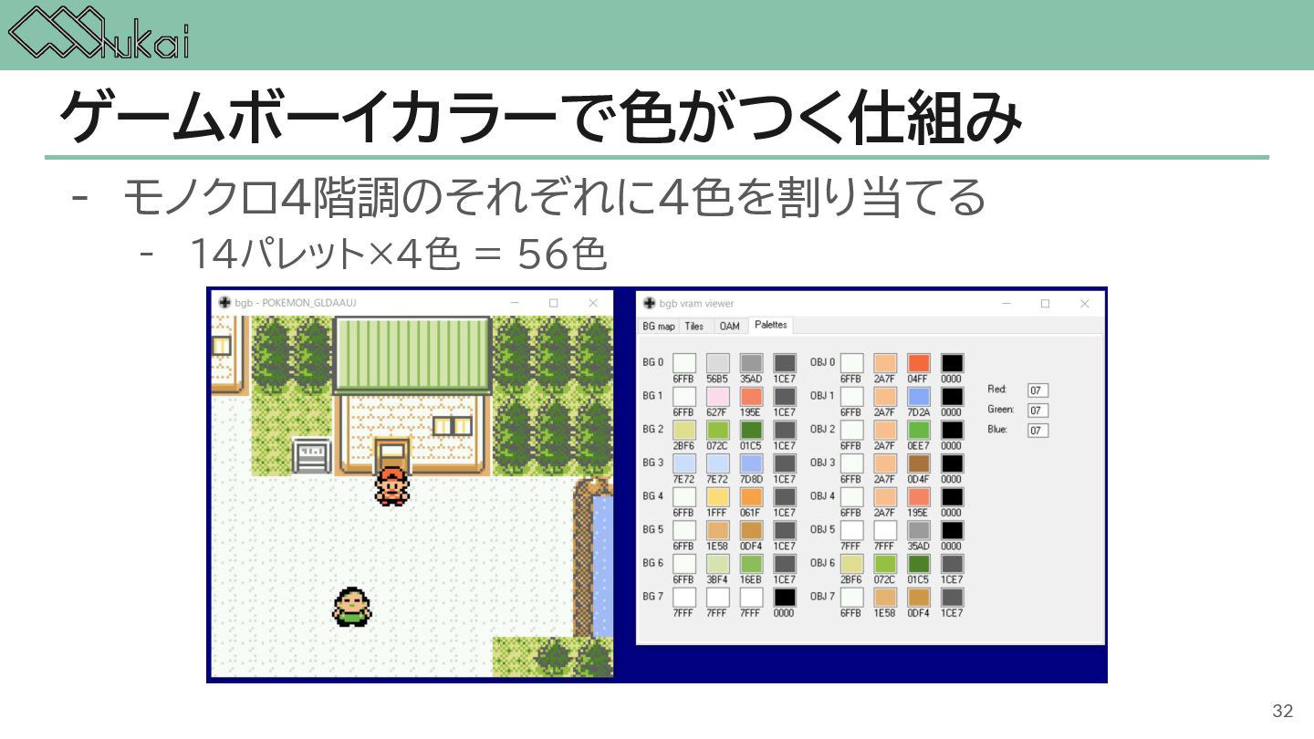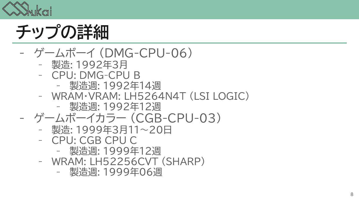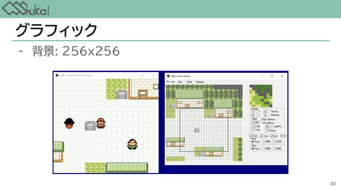 MHz CGB-CPU (8bit CISC) @ 4.19 MHz, 8.39 MHz AGB-CPU (ARM7TDMI) @ 16.78 MHz WRAM 8 KB 32 KB 32KB + 256KB VRAM 8 KB 16 KB 96KB Screen モノクロ4階調 STN液晶 160 x 144 ドット 32768色 反射型TFTカラー液晶 160 x 144 ドット 32768色 反射型TFTカラー液晶 240×160 ドット Sound 4チャンネル ステレオ出力 矩形波x2, 波形メモリx1, ノイズx1 4チャンネル ステレオ出力 矩形波x2, 波形メモリx1, ノイズx1 6チャンネル ステレオ出力 矩形波x2, 波形メモリx1, ノイズx1, PCMx2 Power DC 6V 0.7W (単3電池 x 4) DC 3V 0.6W (単3電池 x 2) DC 3V 0.6W (単3電池 x 2) 5