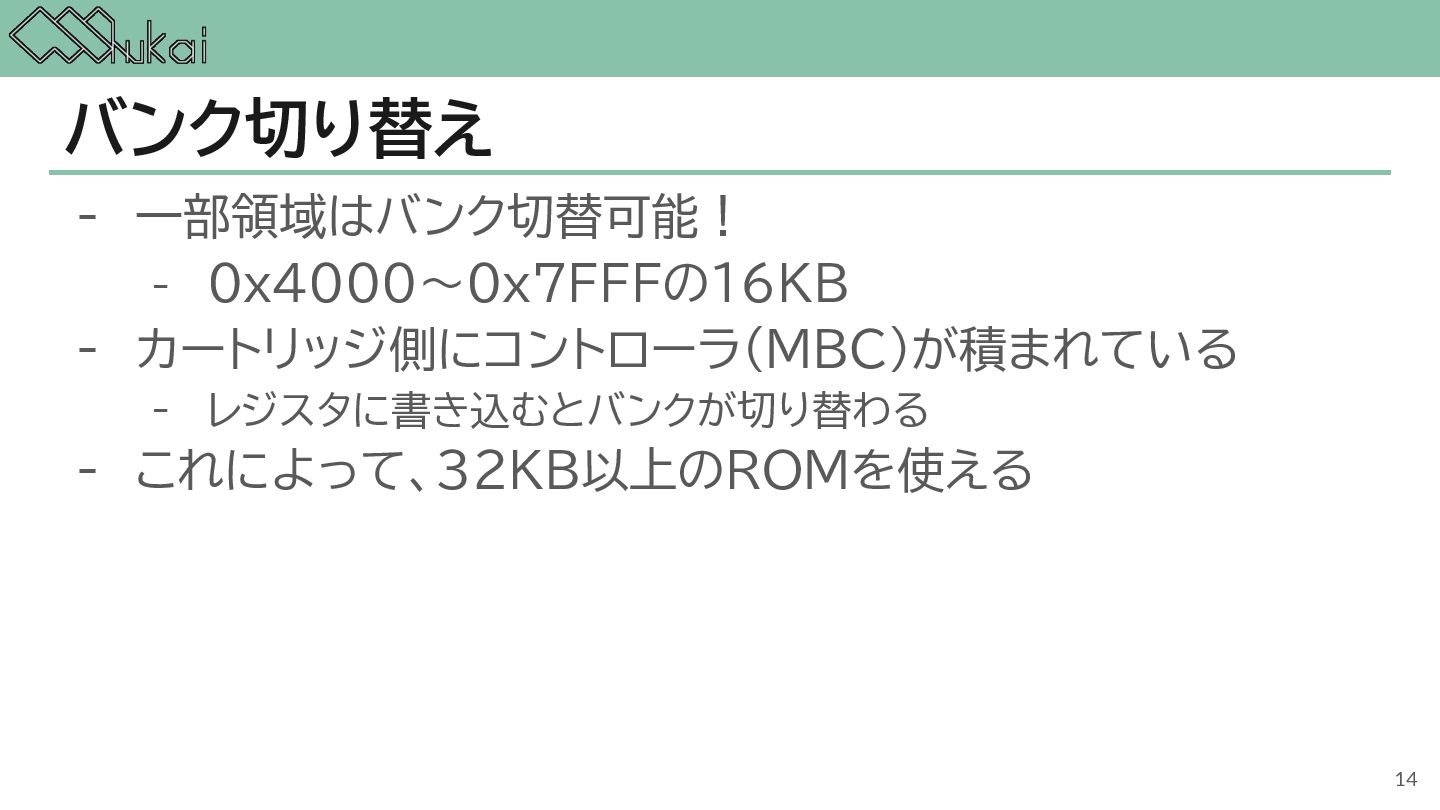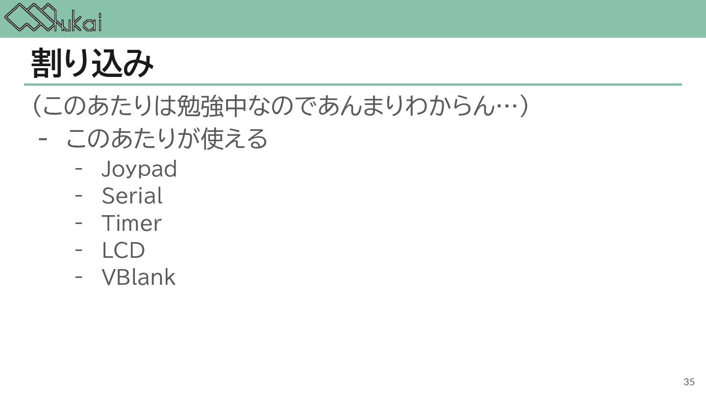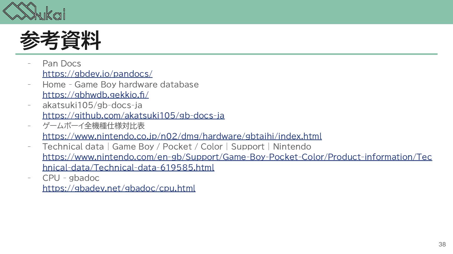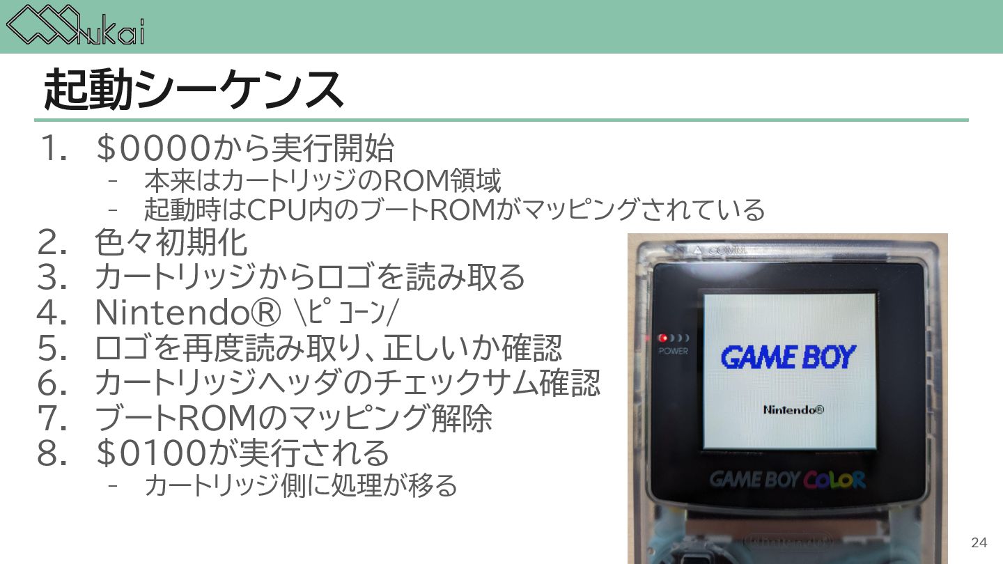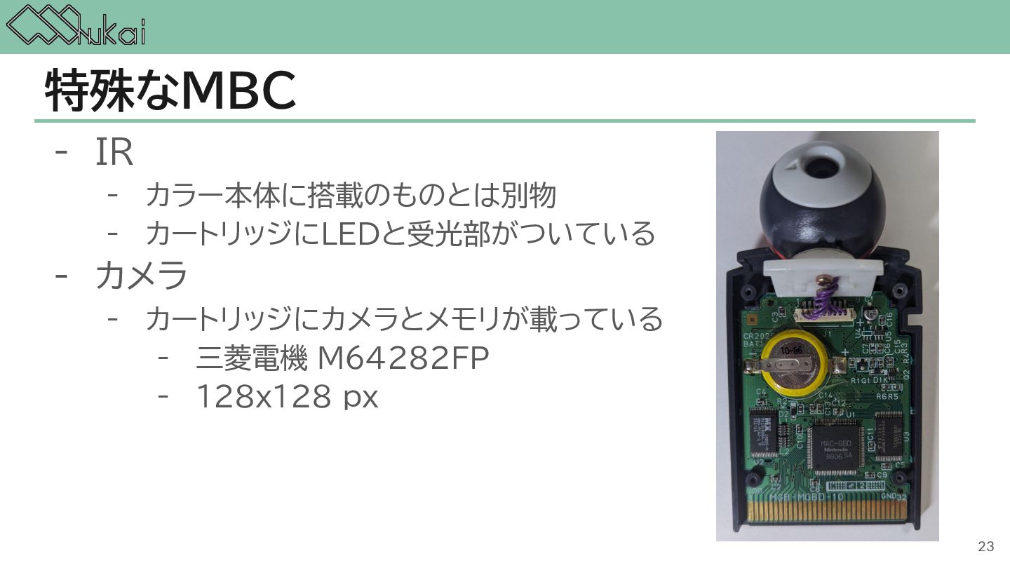 MHz CGB-CPU (8bit CISC) @ 4.19 MHz, 8.39 MHz AGB-CPU (ARM7TDMI) @ 16.78 MHz WRAM 8 KB 32 KB 32KB + 256KB VRAM 8 KB 16 KB 96KB Screen モノクロ4階調 STN液晶 160 x 144 ドット 32768色 反射型TFTカラー液晶 160 x 144 ドット 32768色 反射型TFTカラー液晶 240×160 ドット Sound 4チャンネル ステレオ出力 矩形波x2, 波形メモリx1, ノイズx1 4チャンネル ステレオ出力 矩形波x2, 波形メモリx1, ノイズx1 6チャンネル ステレオ出力 矩形波x2, 波形メモリx1, ノイズx1, PCMx2 Power DC 6V 0.7W (単3電池 x 4) DC 3V 0.6W (単3電池 x 2) DC 3V 0.6W (単3電池 x 2) 5