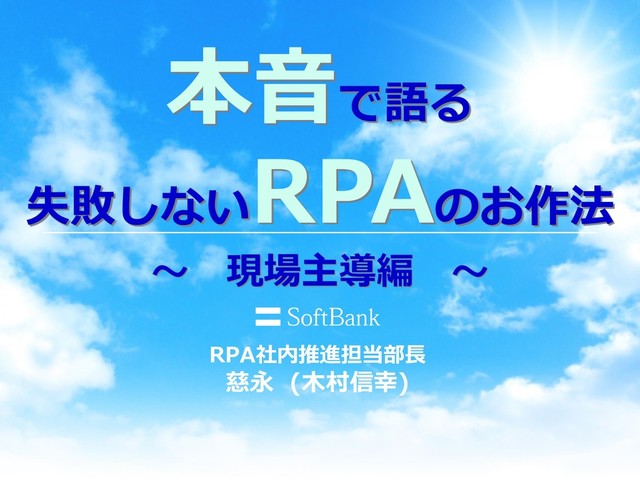 ・ ソフトバンクRPA推進室 RPAメディエーター ・ ソフトバンクユニバーシティ(ICI)認定講師 ・ 日本NLP協会、全米NLP協会 NLP-LABプロファイル®認定コンサルタント&トレーナー ・ 日本NLP協会 NLP認定セールスコンサルタント&トレーナー ・ 日本アンガーマネジメント協会認定 アンガーマネジメントファシリテーター ・ 一般社団法人 和の国 「日本心学協会」副事務局長 • 好きなもの ➢ 不空大灌頂光真言、般若心経、観無量寿経 • バックグラウンド ➢ 転職➋回+合併➁回、債権回収25年!!! • 好きな言葉 ➢ 『天上天下唯我独尊』、『人間だもの』、『煩悩』 FaceBook:kimu777 多数の講演依頼、ありがとうございます!