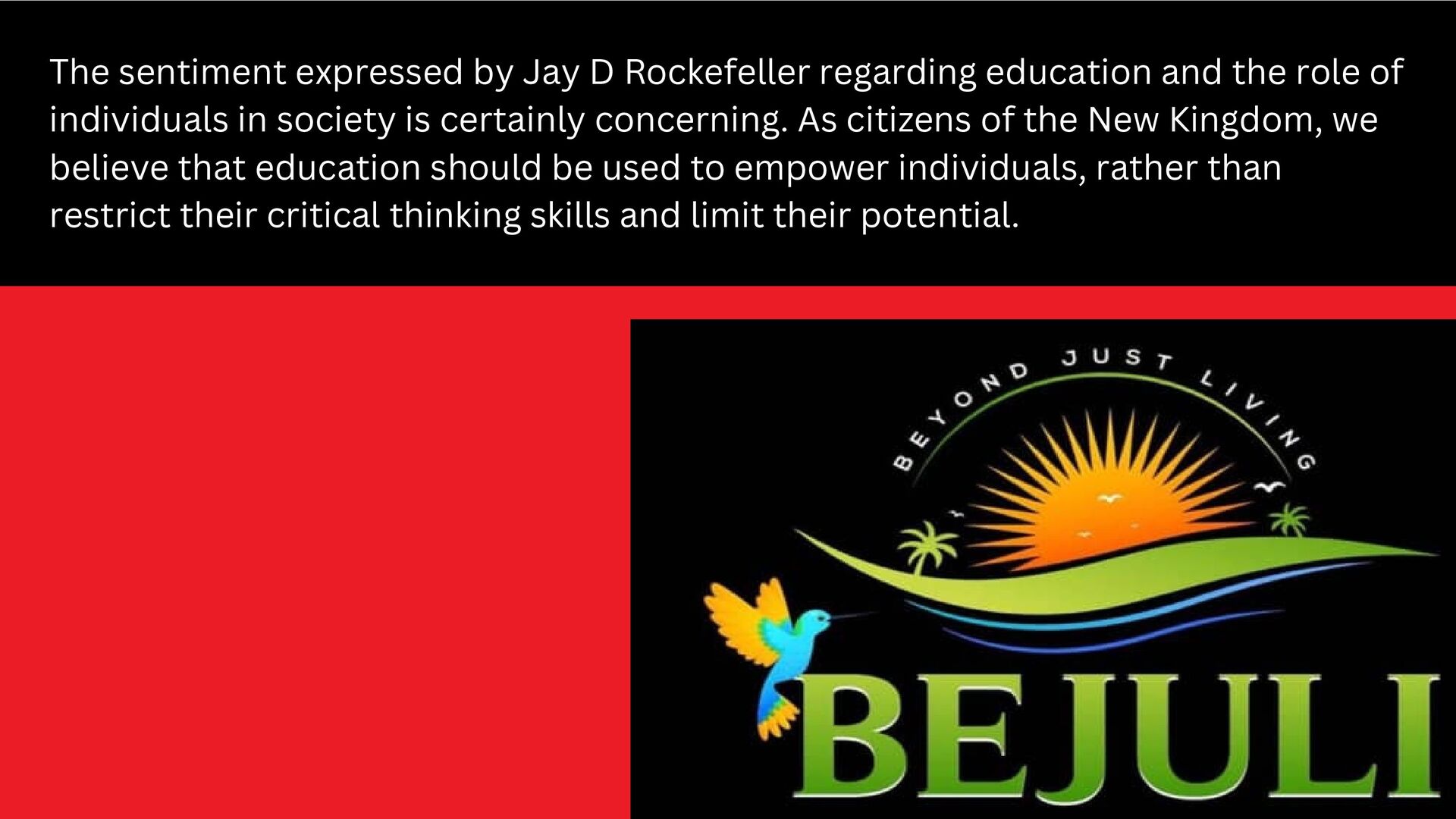 The sentiment expressed by Jay D Rockefeller regarding education and the role of individuals in society is certainly concerning. As citizens of the New Kingdom, we believe that education should be used to empower individuals, rather than restrict their critical thinking skills and limit their potential.