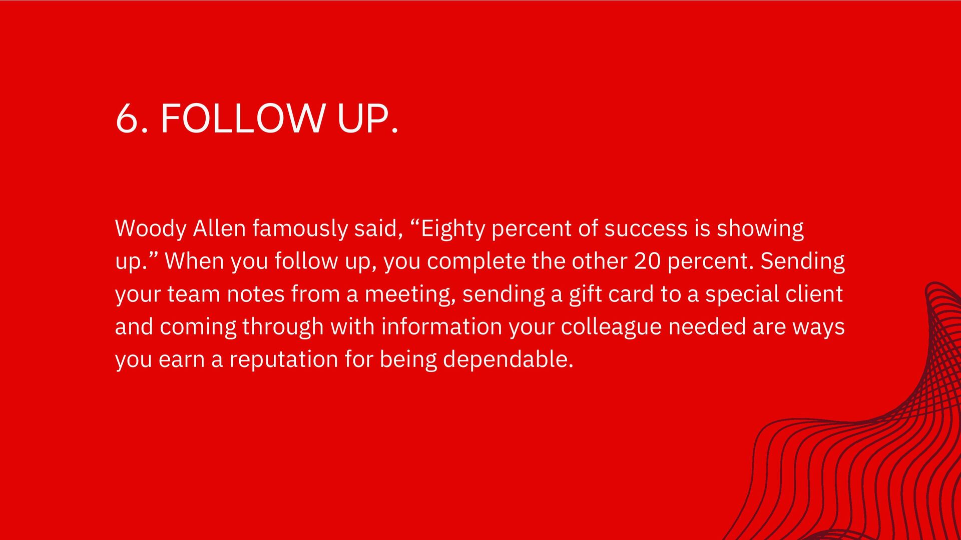 success is showing up.” When you follow up, you complete the other 20 percent. Sending your team notes from a meeting, sending a gift card to a special client and coming through with information your colleague needed are ways you earn a reputation for being dependable.