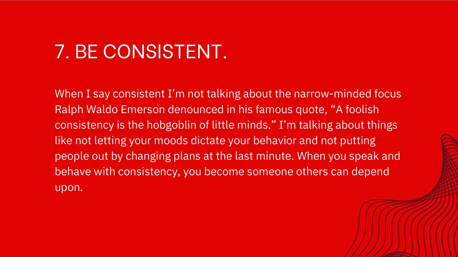 about the narrow-minded focus Ralph Waldo Emerson denounced in his famous quote, “A foolish consistency is the hobgoblin of little minds.” I’m talking about things like not letting your moods dictate your behavior and not putting people out by changing plans at the last minute. When you speak and behave with consistency, you become someone others can depend upon.