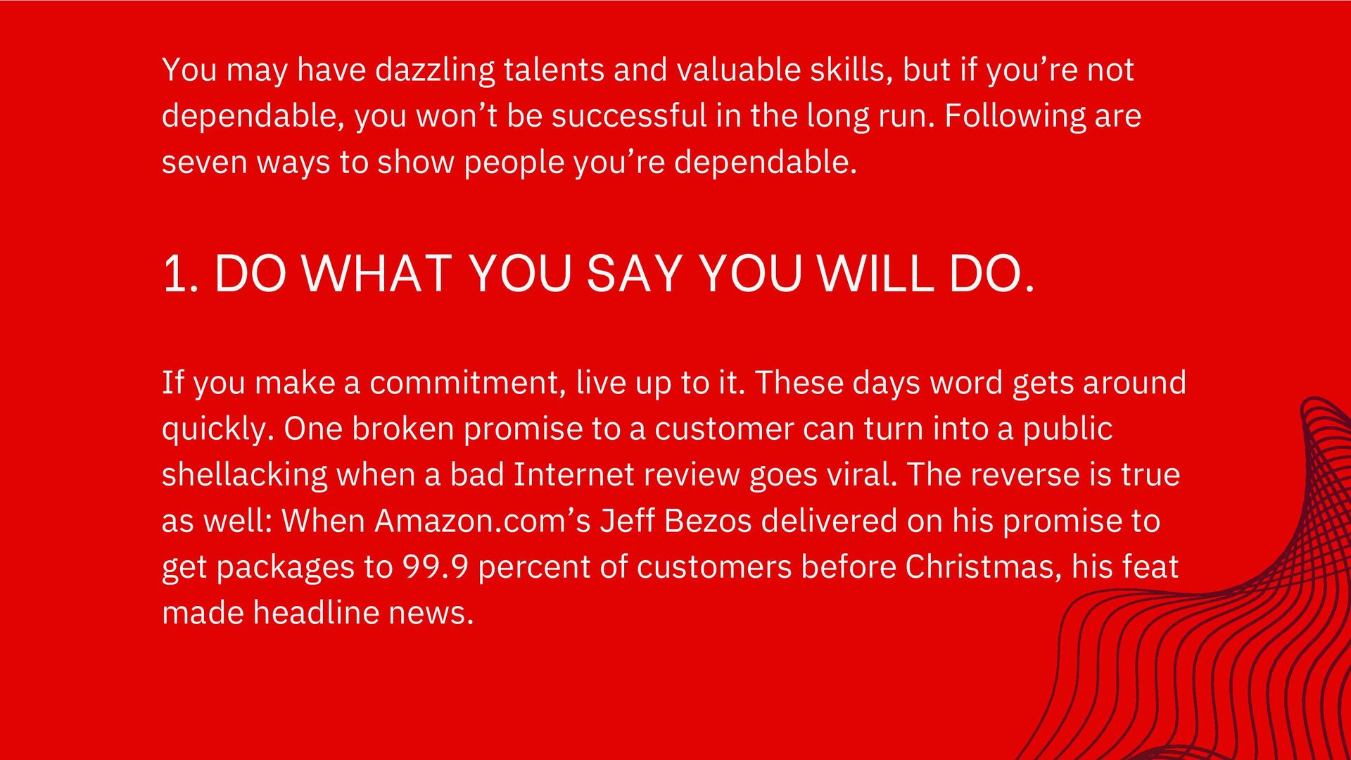 have dazzling talents and valuable skills, but if you’re not dependable, you won’t be successful in the long run. Following are seven ways to show people you’re dependable. If you make a commitment, live up to it. These days word gets around quickly. One broken promise to a customer can turn into a public shellacking when a bad Internet review goes viral. The reverse is true as well: When Amazon.com’s Jeff Bezos delivered on his promise to get packages to 99.9 percent of customers before Christmas, his feat made headline news.