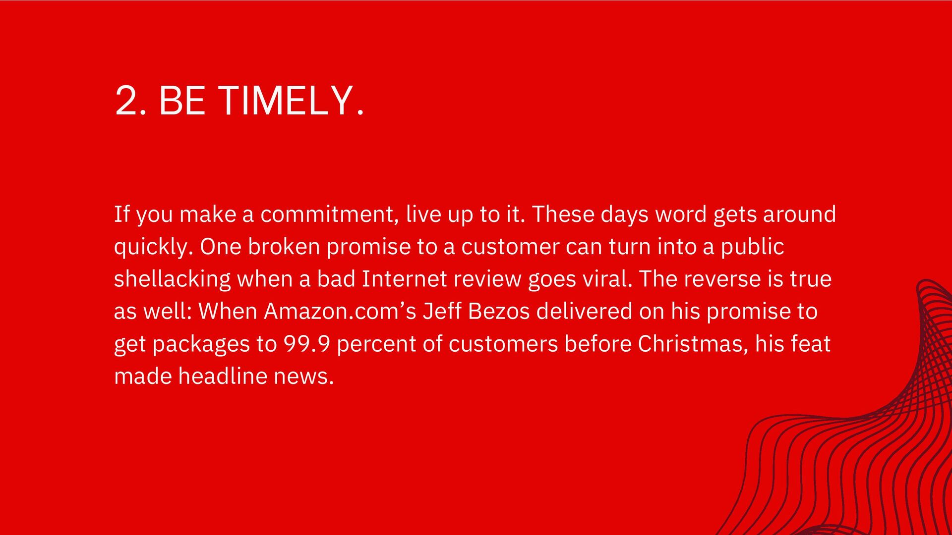 to it. These days word gets around quickly. One broken promise to a customer can turn into a public shellacking when a bad Internet review goes viral. The reverse is true as well: When Amazon.com’s Jeff Bezos delivered on his promise to get packages to 99.9 percent of customers before Christmas, his feat made headline news.