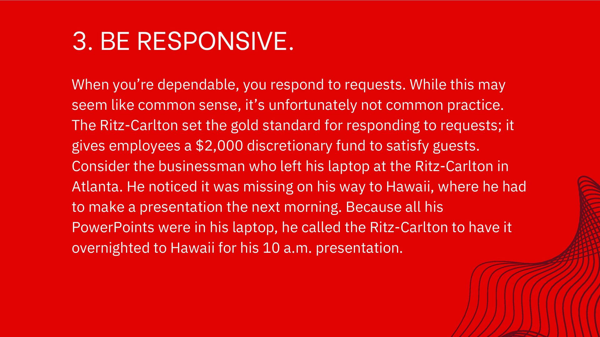 While this may seem like common sense, it’s unfortunately not common practice. The Ritz-Carlton set the gold standard for responding to requests; it gives employees a $2,000 discretionary fund to satisfy guests. Consider the businessman who left his laptop at the Ritz-Carlton in Atlanta. He noticed it was missing on his way to Hawaii, where he had to make a presentation the next morning. Because all his PowerPoints were in his laptop, he called the Ritz-Carlton to have it overnighted to Hawaii for his 10 a.m. presentation.
