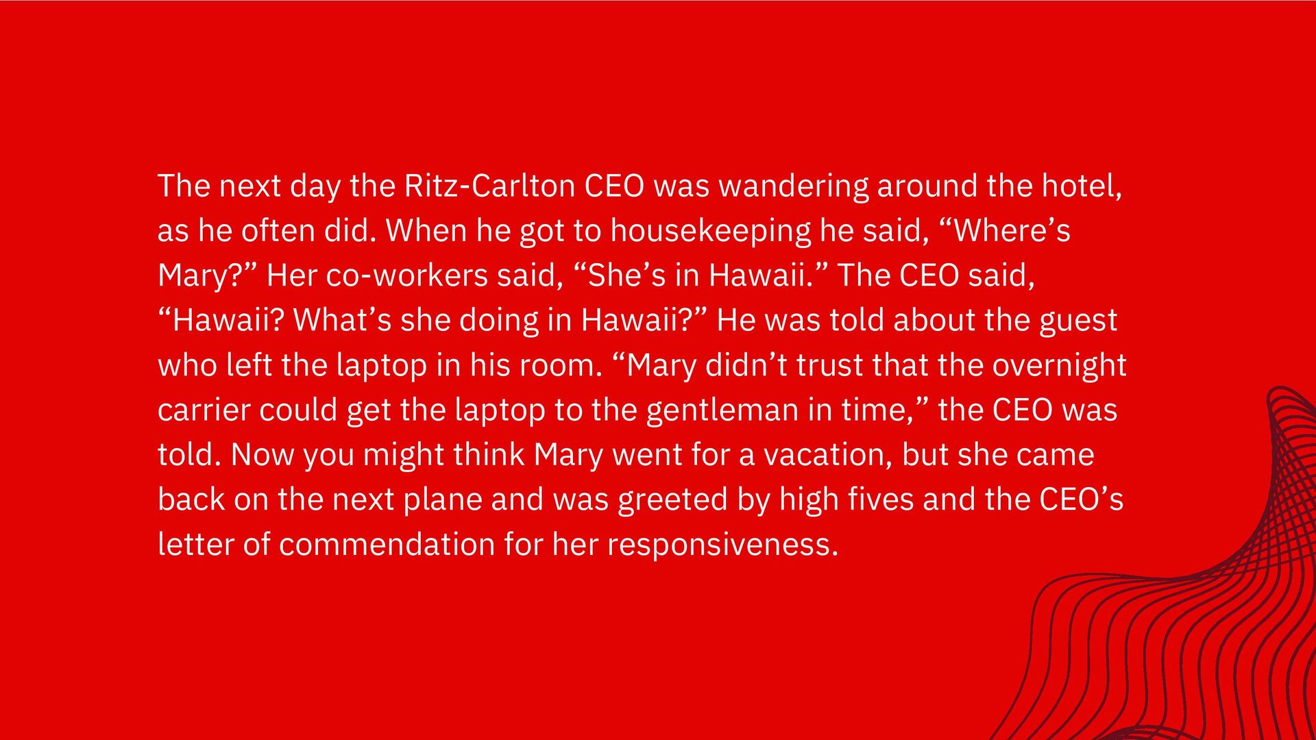 hotel, as he often did. When he got to housekeeping he said, “Where’s Mary?” Her co-workers said, “She’s in Hawaii.” The CEO said, “Hawaii? What’s she doing in Hawaii?” He was told about the guest who left the laptop in his room. “Mary didn’t trust that the overnight carrier could get the laptop to the gentleman in time,” the CEO was told. Now you might think Mary went for a vacation, but she came back on the next plane and was greeted by high fives and the CEO’s letter of commendation for her responsiveness.