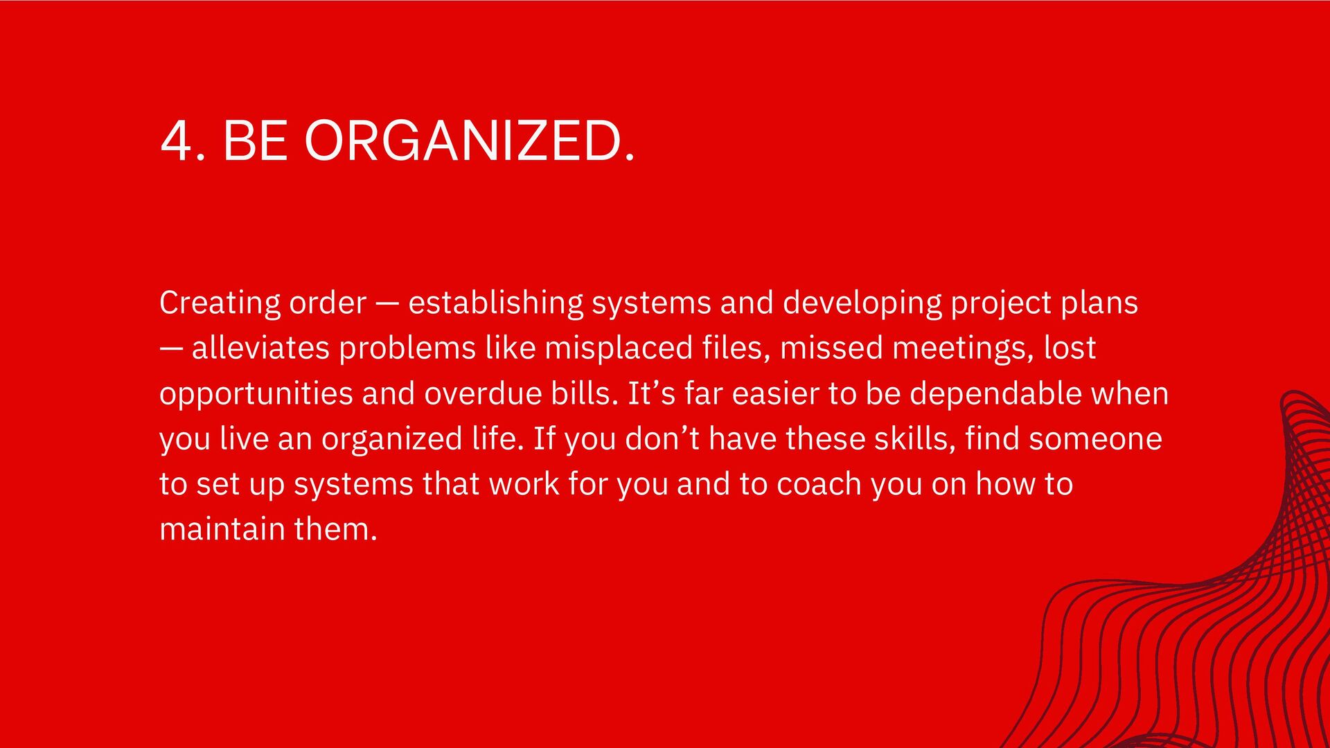 project plans — alleviates problems like misplaced files, missed meetings, lost opportunities and overdue bills. It’s far easier to be dependable when you live an organized life. If you don’t have these skills, find someone to set up systems that work for you and to coach you on how to maintain them.