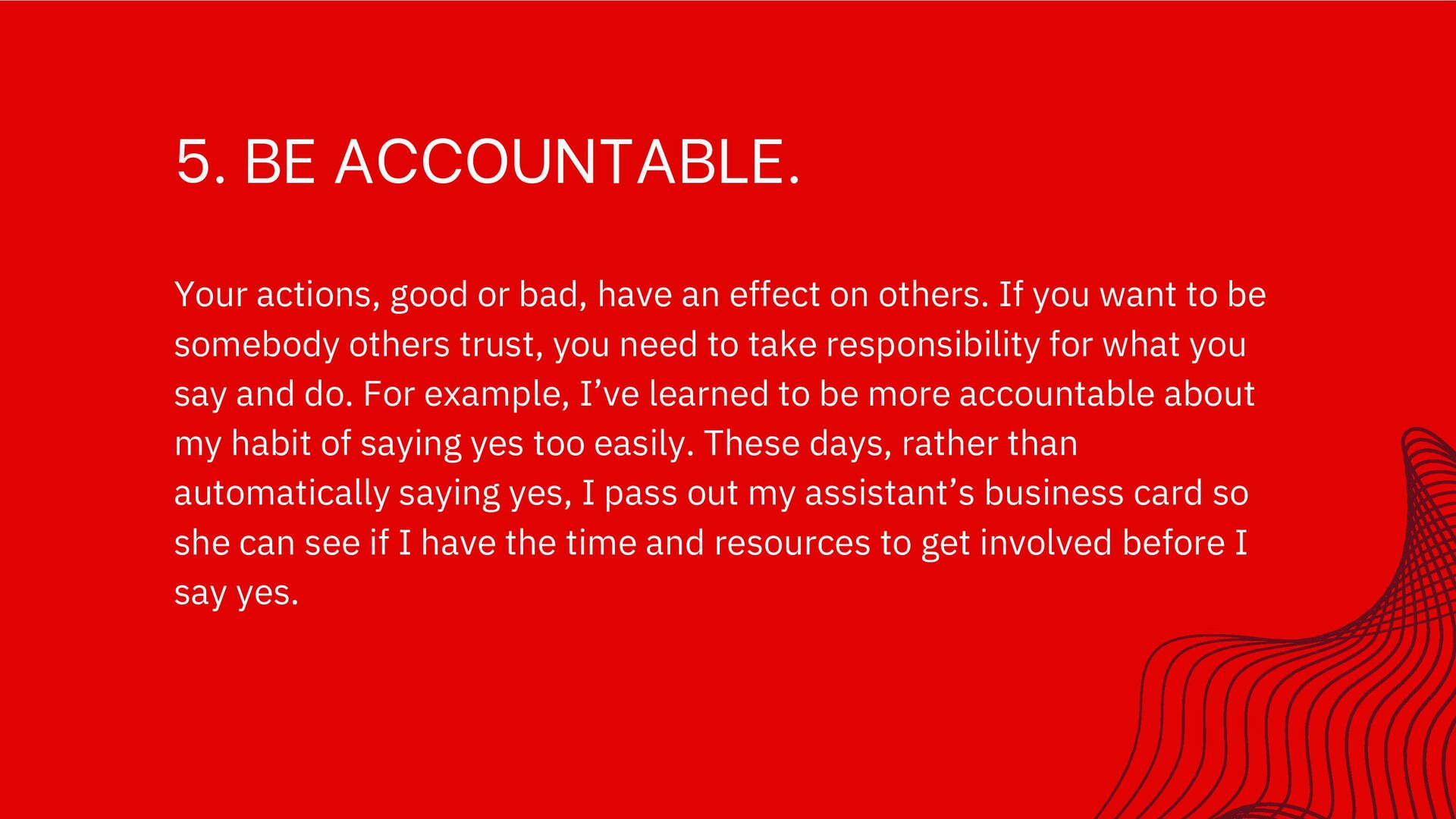 effect on others. If you want to be somebody others trust, you need to take responsibility for what you say and do. For example, I’ve learned to be more accountable about my habit of saying yes too easily. These days, rather than automatically saying yes, I pass out my assistant’s business card so she can see if I have the time and resources to get involved before I say yes.
