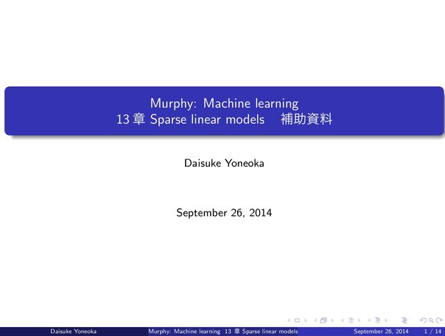 γ, σ2 ∼ N( γjwjxij, σ2) γj ∼ Ber(π0 ) wj ∼ N(0, σ2 w ) Called Bernoulli-Gaussian model or binary mask model. (γj ͕ wj Λ mask out ͯ͠ ͍Δ) binary mask: γj → y ← wj vs slab: γj → wj → y γj ͱ wj ͷࣝผੑ͕ͳ͘ γj wj ͔ࣝ͠ผෆՄ ͪΐ ͬͱ͍͍͜ͱ͋ΔΑʂNon-Bayeisan ʹ׳Ε͠·Ε͍ͯΔײ͡ʹͳΔ Joint prior p(γ, w) ∝ N(0, σ2 w )π∥γ∥0 0 (1 − π0)D−∥γ∥0 ͜͏͢Δͱ log posterior f(γ, w) ≡ −2σ2 log p(γ, w, y|X) = ∥y − X(γ. ∗ w)∥2 + σ2 σ2 w ∥w∥2 + λ∥γ∥0 + const, ͨͩ͠ γ ≡ 2σ2 log( 1 − π0 π0 ). w−γ = 0 ͱ wγ Λ γ ͕ 0 or 1 ͷͱ͖ͷ w ͱ͠,σ2 w → ∞ Ͱ f(γ, w) = ∥y − Xγwγ∥2 2 + λ∥γ∥0. ɹ͜Εͬͯ, ্ͷ BIC ͷࣜʹࣅ͍ͯΔΑͶ l0 regularization; γ ͏ͷΊͯ,support ͱͯ͠ w ͷॏཁੑΛද͢มΛఆٛ͢Δ͜ ͱͰ f(w) = ∥y − Xw∥2 2 + λ∥w∥0 ͜ΕͰ࠷దԽΛ γ ∈ {0, 1} ͷ͔̎Β࿈ଓ w ʹมՄೳ. Ͱ, ୈೋ߲·ͩ·ͩ ࠷దԽ͠ʹ͍͘! Daisuke Yoneoka Murphy: Machine learning 13 ষ Sparse linear models ɹิॿࢿྉ September 26, 2014 6 / 14