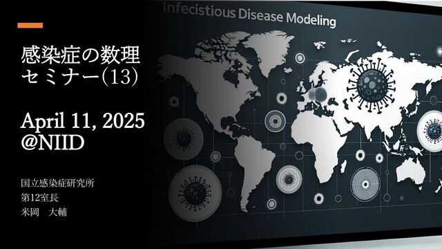 人口の異質性とSIR 6. 再生産方程式とエボラ vs インフル 7. R 0 の推定方法(流行初期) 8. 内的増殖率の検定 9. Effective distance 10. 分岐過程 (Branching process) 11. 大規模流行確率と水際対策 12. Backcalculation 13. 致死率の計算 14. (シンプルな)ワクチン接種の自然史と流行条件 15. ワクチン接種VEの推定 16. 従属性現象における因果推論 17. ワクチン接種戦略について 本書の内容をカバーします。 具体的なコードなどは右の本 詳細なプログラムなどは https://github.com/objornstad/epimdr/tree/ master/rcode (結構間違ってる。。。) 2/48