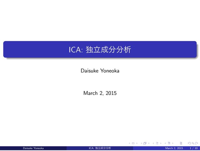 ʹ Gaussian ΛԾఆ͍ͯͨ͠. p(zt) = ΠL j=1 N(zij |0, 1) ಠཱͱແ૬ؔͷҧ͍ɿ(Ұൠతʹݴͬͯ) ಠཱແݶͷΫϩεϞʔϝϯτ=0 Ͱ, ແ૬ؔೋ࣍ͷϞʔϝϯτ͕ 0 PCA ͷ Gaussian ͷ߹, 3 ࣍Ҏ্ͷϞʔϝϯτ͕ 0 ͳͷͰ, ಠཱ=ແ૬ؔ ݁Ռͱͯ͠ճసʹର͢ΔෆఆੑΛ͢ ICA Non Gaussian ΛԾఆ͢Δ͜ͱͰճసʹର͢ΔෆఆੑΛআ͘. p(zt ) = ΠL j=1 pj (zij ) ॱংʹର͢Δෆఆੑͱ power ʹର͢Δෆఆੑ, ͦΕͰΔ W ∗ = P ΛW Ͱ P permutation, Λ ڧ͞Λม͢Δߦྻ Daisuke Yoneoka ICA: ಠཱੳ March 2, 2015 4 / 10
