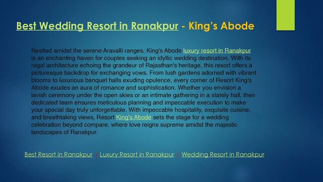 in Ranakpur | Luxury Resort in Ranakpur | Wedding Resort in Ranakpur Nestled amidst the serene Aravalli ranges, King's Abode luxury resort in Ranakpur is an enchanting haven for couples seeking an idyllic wedding destination. With its regal architecture echoing the grandeur of Rajasthan's heritage, this resort offers a picturesque backdrop for exchanging vows. From lush gardens adorned with vibrant blooms to luxurious banquet halls exuding opulence, every corner of Resort King's Abode exudes an aura of romance and sophistication. Whether you envision a lavish ceremony under the open skies or an intimate gathering in a stately hall, their dedicated team ensures meticulous planning and impeccable execution to make your special day truly unforgettable. With impeccable hospitality, exquisite cuisine, and breathtaking views, Resort King's Abode sets the stage for a wedding celebration beyond compare, where love reigns supreme amidst the majestic landscapes of Ranakpur.