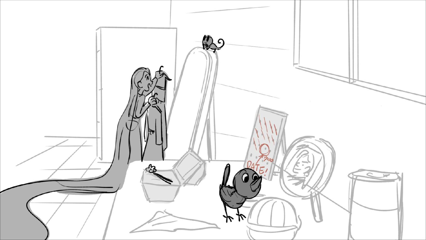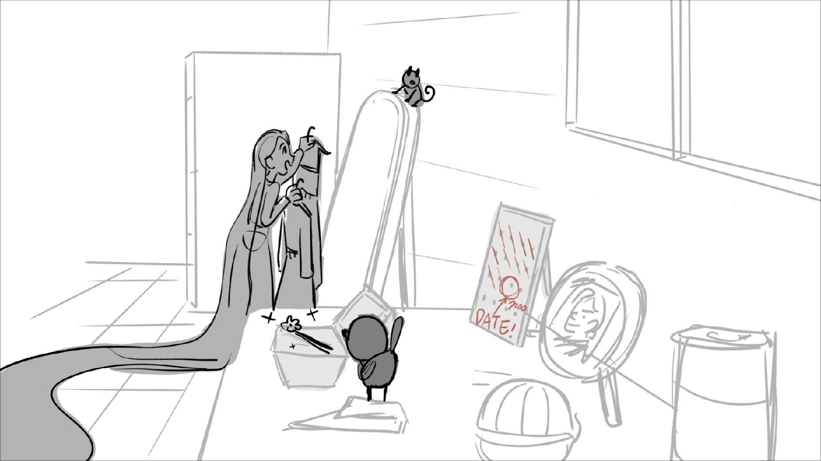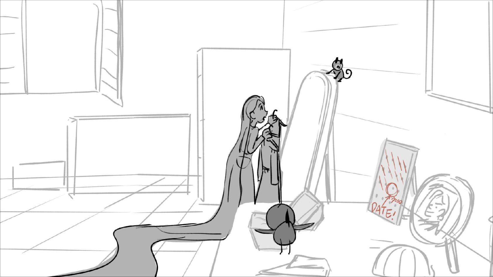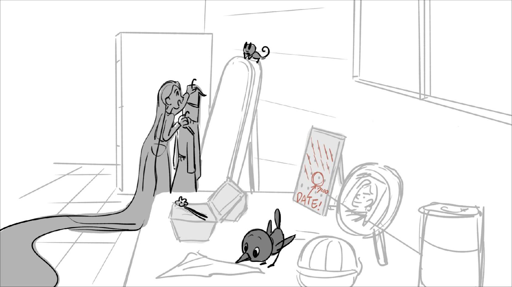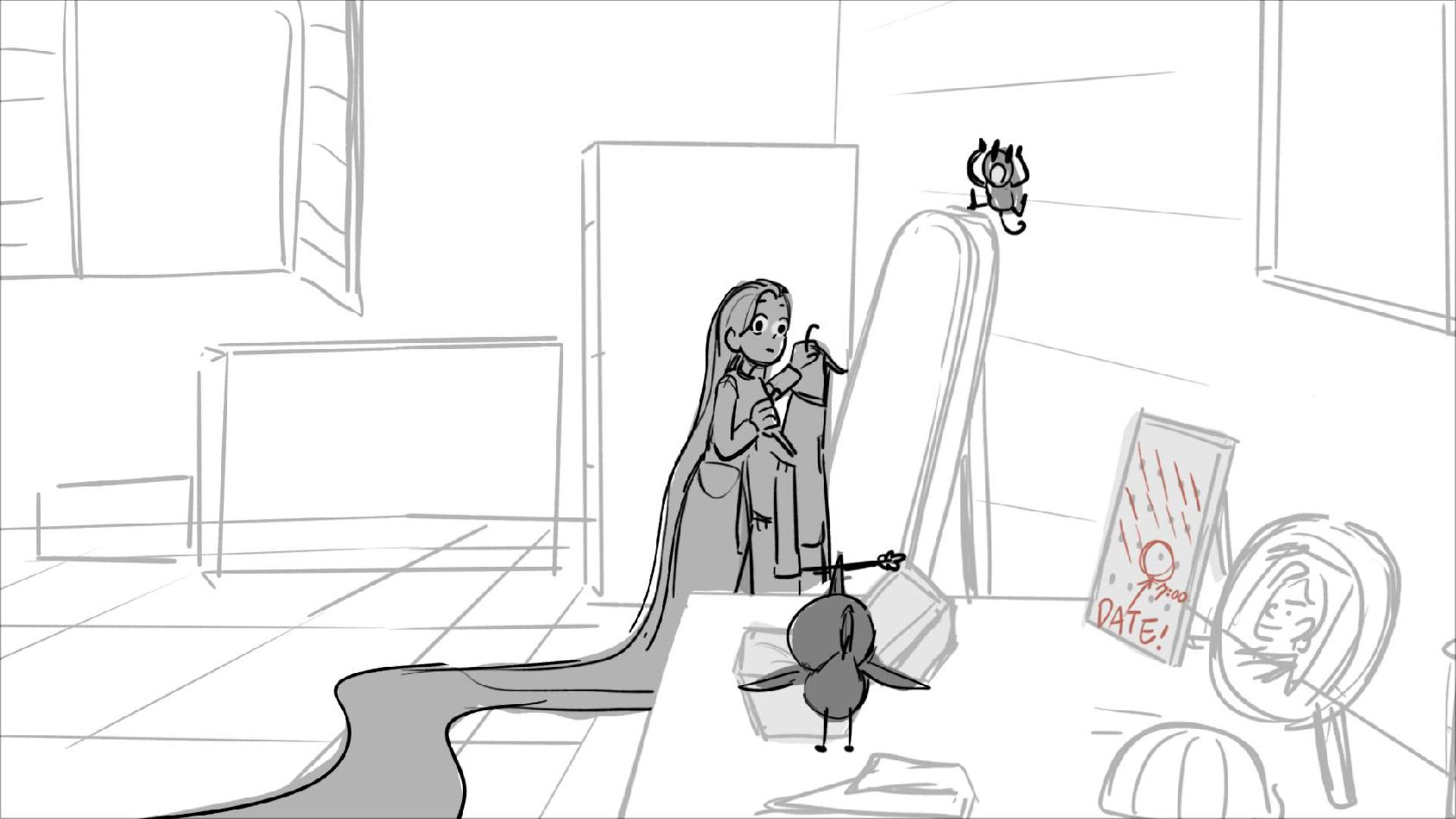 Using character's from "Tangled". A comedy scene of Rapunzel getting ready for a date to meet Eugene.