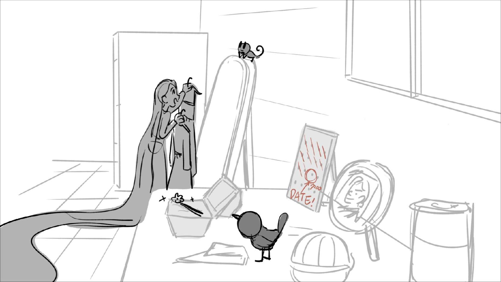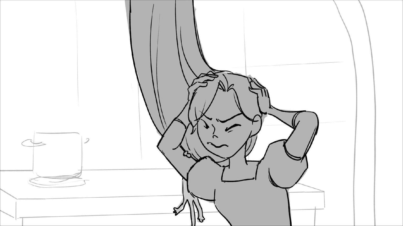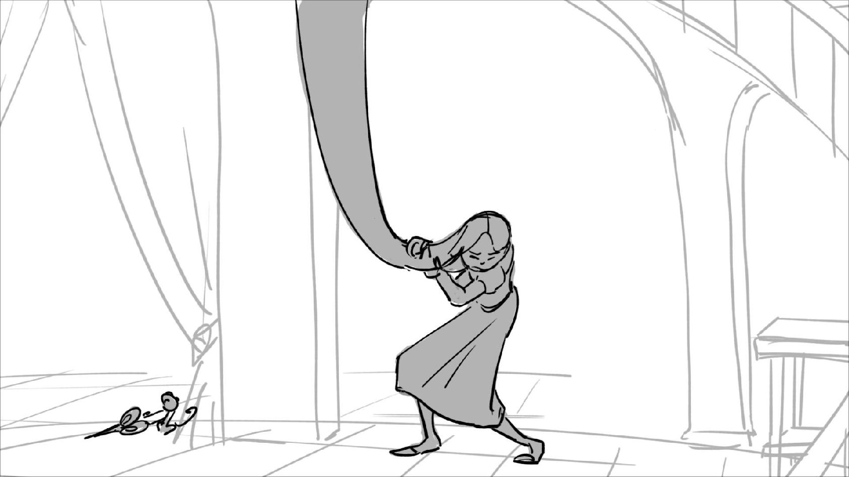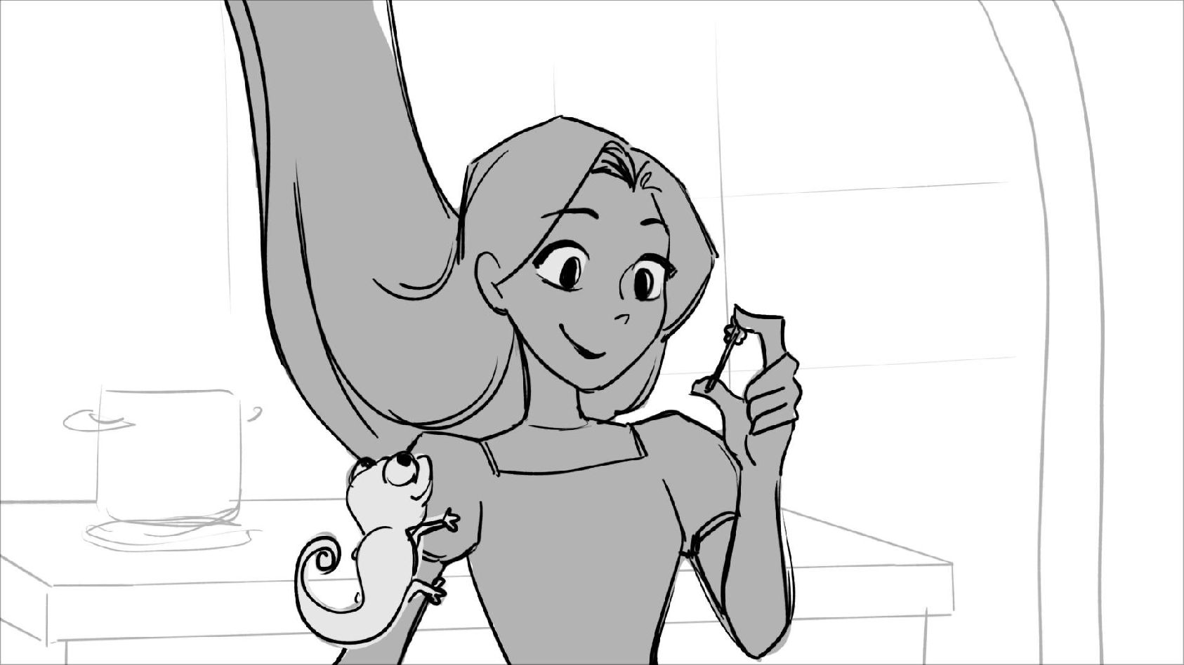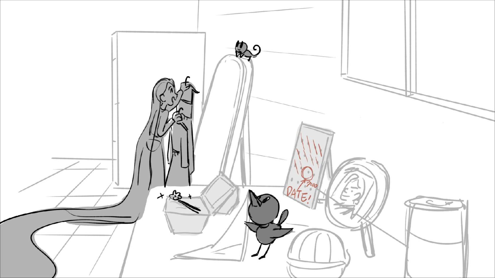 Using character's from "Tangled". A comedy scene of Rapunzel getting ready for a date to meet Eugene.