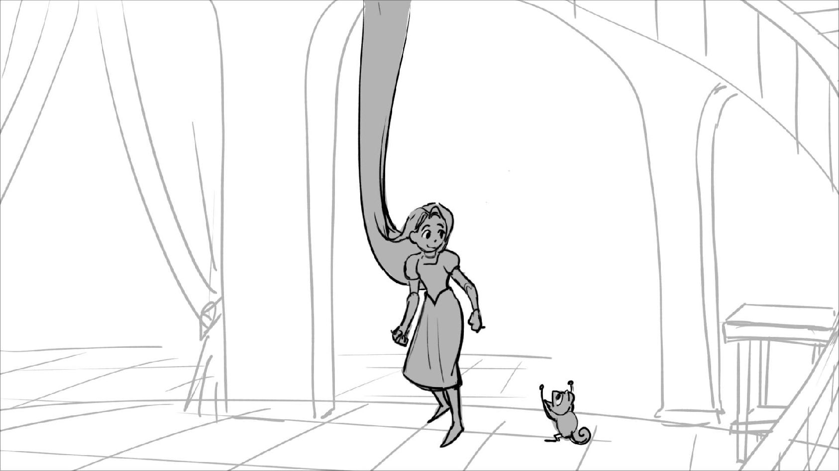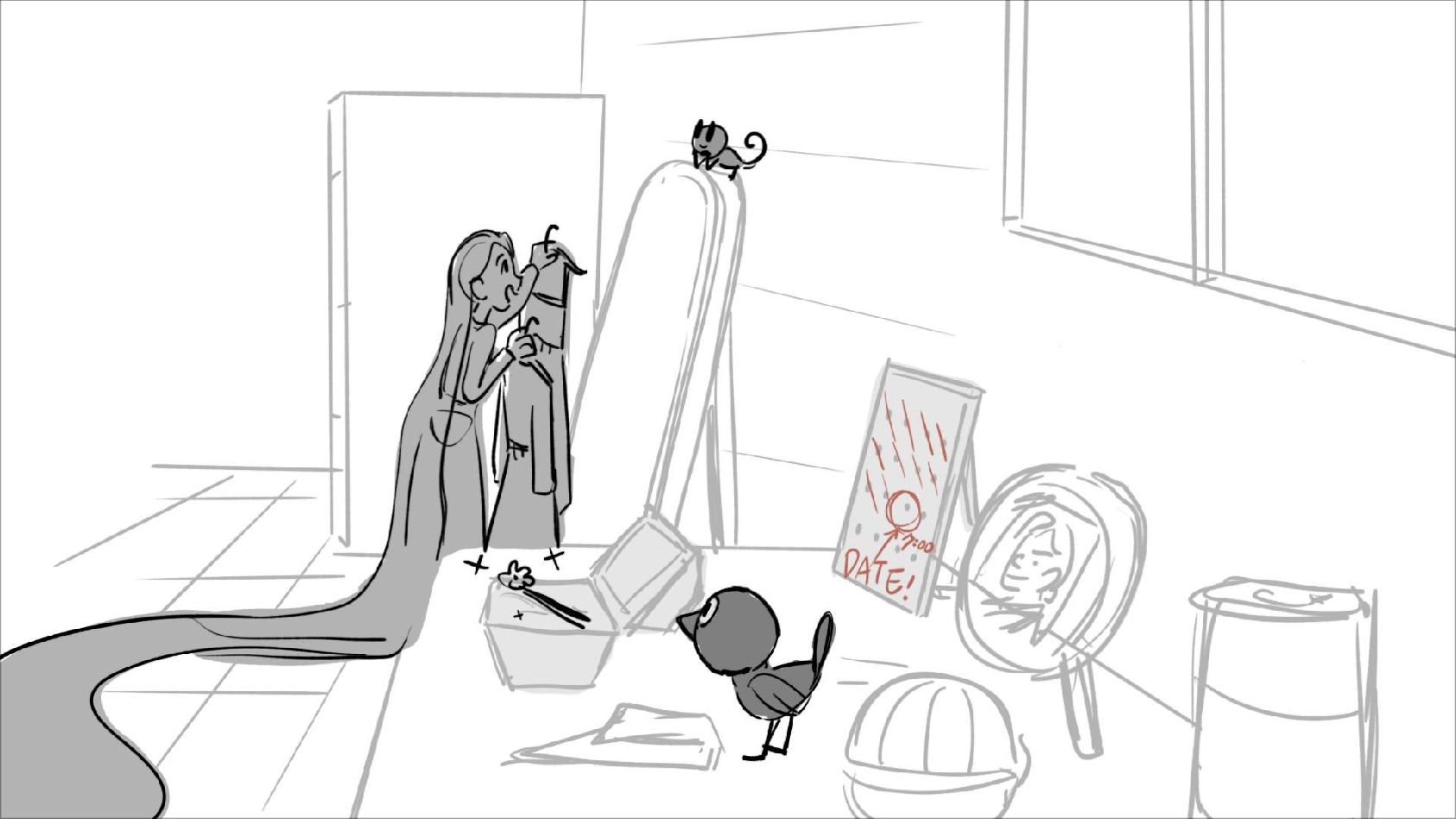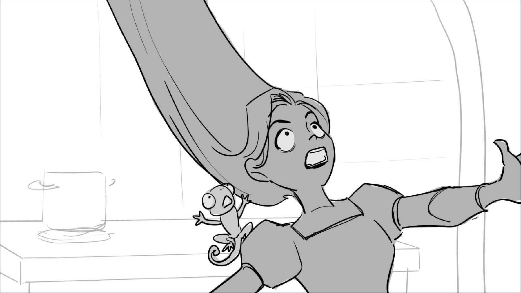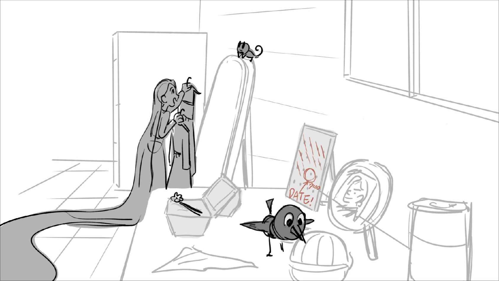 Using character's from "Tangled". A comedy scene of Rapunzel getting ready for a date to meet Eugene.