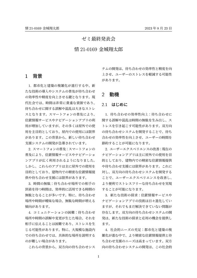 γεςϜͷ֦ுੑʹؔ͢Δݕূ 1:1 ͷͪ߹Θ͚ͤͩͰͳ͘ɺେਓ: େਓ ͷͪ߹ΘͤͰγεςϜ͕ޮՌతʹಈ࡞͢Δ ͔ݕূ͢Δɻ Ծઆ: γεςϜେਓಉ࢜ͷͪ߹Θͤʹ ͓͍ͯɺޮతͳͪ߹ΘͤΛαϙʔτ͢Δ ͜ͱ͕Ͱ͖Δɻ ݕূํ๏: େਓͷάϧʔϓΛ 2 ͭ༻ҙ͠ɺ֤άϧʔ ϓͰҐஔใΛڞ༗͢ΔܗͰͪ߹ΘͤΛߦ ͏ɻͪ߹Θͤͷޭॴཁ࣌ؒΛଌఆ͠ɺ γεςϜͷ֦ுੑΛධՁ͢Δɻ͜ΕΒͷݕূΛ ௨ͯ͡ɺఏҊ͞ΕͨγεςϜͷ༗ޮੑ Λ໌Β͔ʹ͠ɺߋͳΔվળൃలΛࢦ͢͜ͱ ͕Ͱ͖·͢ɻ 7 ࢀߟࢿྉ ༷ʑͳݚڀٕज़͕ͪ߹ΘͤࢧԉγεςϜ ͷ։ൃʹؔ࿈͍ͯ͠·͢ɻҎԼͷࢀߟࢿྉɺ ຊݚڀͷഎܠಈػɺؔ࿈ݚڀϫʔυɺγες ϜͷఏҊɺࠓޙͷ՝Ծઆݕূʹؔ࿈͢Δࢿ ྉͰ͢ɻ https://ipsj.ixsq.nii.ac.jp/ej/ ?action=pages_view_main&active_ action=repository_view_main_item_ detail&item_id=46214&item_no=1&page_ id=13&block_id=8 https://dl.nkmr-lab.org/papers/324/ paper.pdf https://docs.expo.dev/versions/ latest/sdk/map-view/ https://qiita.com/11-1010-100/ items/be4a61f96ce07dcc413d https://qiita.com/zaburo/items/ 0bd2e92fb10c50767538 https://hosochin.com/2021/01/03/ post-738/ https://zenn.dev/toshi023/scraps/ becf40a2247223 https://ipsj.ixsq.nii.ac.jp/ej/ ?action=pages_view_main&active_ action=repository_view_main_item_ detail&item_id=43753&item_no=1&page_ id=13&block_id=8 https://www.interaction-ipsj.org/ archives/paper2010/demo/0085/0085. pdf https://ipsj.ixsq.nii.ac.jp/ej/ ?action=pages_view_main&active_ action=repository_view_main_item_ detail&item_id=81420&item_no=1&page_ id=13&block_id=8 https://www.interaction-ipsj.org/ archives/paper2010/demo/0085/0085. pdf ԁͳ߹ͤࢧԉͷͨΊͷίϯύεΠ ϯλϑΣʔεΛ༻͍ͨಈతφϏήʔγϣϯγε ςϜͷఏҊͱࢼ࡞ https://dl.nkmr-lab.org/papers/324 ͪ߹ΘͤͷࠔੑΛࠨӈ͢Δॴͷୡͱ Ѳʹؔ͢Δௐࠪ https://ipsj.ixsq.nii.ac.jp/ej/ ?action=pages_view_main&active_ action=repository_view_main_item_ detail&item_id=46214&item_no=1&page_ id=13&block_id=8 ͪ߹ΘͤΛࢧԉ͢Δڠ ௐφϏήʔγϣϯͷఏҊ 4