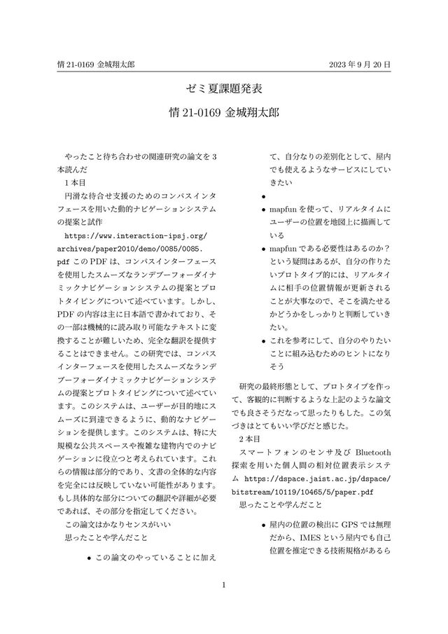 21-0169 ۚᠳଠ ͬͨ͜ͱͪ߹Θͤͷؔ࿈ݚڀͷจΛ 3 ຊಡΜͩ 1 ຊ ԁͳ߹ͤࢧԉͷͨΊͷίϯύεΠϯλ ϑΣʔεΛ༻͍ͨಈతφϏήʔγϣϯγεςϜ ͷఏҊͱࢼ࡞ https://www.interaction-ipsj.org/ archives/paper2010/demo/0085/0085. pdf ͜ͷ PDF ɺίϯύεΠϯλʔϑΣʔε Λ༻ͨ͠εϜʔζͳϥϯσϒʔϑΥʔμΠφ ϛοΫφϏήʔγϣϯγεςϜͷఏҊͱϓϩ τλΠϐϯάʹ͍ͭͯड़͍ͯ·͢ɻ͔͠͠ɺ PDF ͷ༰ओʹຊޠͰॻ͔Ε͓ͯΓɺͦ ͷҰ෦ػցతʹಡΈऔΓՄೳͳςΩετʹม ͢Δ͜ͱ͕͍ͨ͠Ίɺશͳ༁Λఏڙ͢ Δ͜ͱͰ͖·ͤΜɻ͜ͷݚڀͰɺίϯύε ΠϯλʔϑΣʔεΛ༻ͨ͠εϜʔζͳϥϯσ ϒʔϑΥʔμΠφϛοΫφϏήʔγϣϯγες ϜͷఏҊͱϓϩτλΠϐϯάʹ͍ͭͯड़͍ͯ ·͢ɻ͜ͷγεςϜɺϢʔβʔ͕తʹε Ϝʔζʹ౸ୡͰ͖ΔΑ͏ʹɺಈతͳφϏήʔ γϣϯΛఏڙ͠·͢ɻ͜ͷγεςϜɺಛʹେ نͳެڞεϖʔεෳࡶͳݐͰͷφϏ ήʔγϣϯʹཱͭͱߟ͑ΒΕ͍ͯ·͢ɻ͜Ε Βͷใ෦తͰ͋Γɺจॻͷશମతͳ༰ Λશʹө͍ͯ͠ͳ͍Մೳੑ͕͋Γ·͢ɻ ͠۩ମతͳ෦ʹ͍ͭͯͷ༁ৄࡉ͕ඞཁ Ͱ͋Εɺͦͷ෦Λࢦఆ͍ͯͩ͘͠͞ɻ ͜ͷจ͔ͳΓηϯε͕͍͍ ࢥͬͨ͜ͱֶΜͩ͜ͱ • ͜ͷจͷ͍ͬͯΔ͜ͱʹՃ͑ ͯɺࣗͳΓͷࠩผԽͱͯ͠ɺ Ͱ͑ΔΑ͏ͳαʔϏεʹ͍ͯ͠ ͖͍ͨ • • mapfun ΛͬͯɺϦΞϧλΠϜʹ ϢʔβʔͷҐஔΛਤ্ʹඳըͯ͠ ͍Δ • mapfun Ͱ͋Δඞཁੑ͋Δͷ͔ʁ ͱ͍͏ٙ͋Δ͕ɺࣗͷ࡞Γͨ ͍ϓϩτλΠϓతʹɺϦΞϧλΠ Ϝʹ૬खͷҐஔใ͕ߋ৽͞ΕΔ ͜ͱ͕େࣄͳͷͰɺͦ͜ΛຬͨͤΔ ͔Ͳ͏͔Λ͔ͬ͠Γͱஅ͍͖ͯ͠ ͍ͨɻ • ͜ΕΛࢀߟʹͯ͠ɺࣗͷΓ͍ͨ ͜ͱʹΈࠐΉͨΊͷώϯτʹͳΓ ͦ͏ ݚڀͷ࠷ऴܗଶͱͯ͠ɺϓϩτλΠϓΛ࡞ͬ ͯɺ٬؍తʹஅ͢ΔΑ͏ͳ্هͷΑ͏ͳจ Ͱྑͦ͞͏ͩͳͬͯࢥͬͨΓͨ͠ɻ͜ͷؾ ͖ͮͱֶ͍͍ͯͼͩͱײͨ͡ɻ 2 ຊ εϚʔτϑΥϯͷηϯαٴͼ Bluetooth ୳ࡧΛ༻͍ͨݸਓؒͷ૬ରҐஔදࣔγες Ϝ https://dspace.jaist.ac.jp/dspace/ bitstream/10119/10465/5/paper.pdf ࢥͬͨ͜ͱֶΜͩ͜ͱ • ͷҐஔͷݕग़ʹ GPS Ͱແཧ ͔ͩΒɺIMES ͱ͍͏Ͱࣗݾ ҐஔΛਪఆͰ͖Δٕज़ن͕֨͋ΔΒ 1