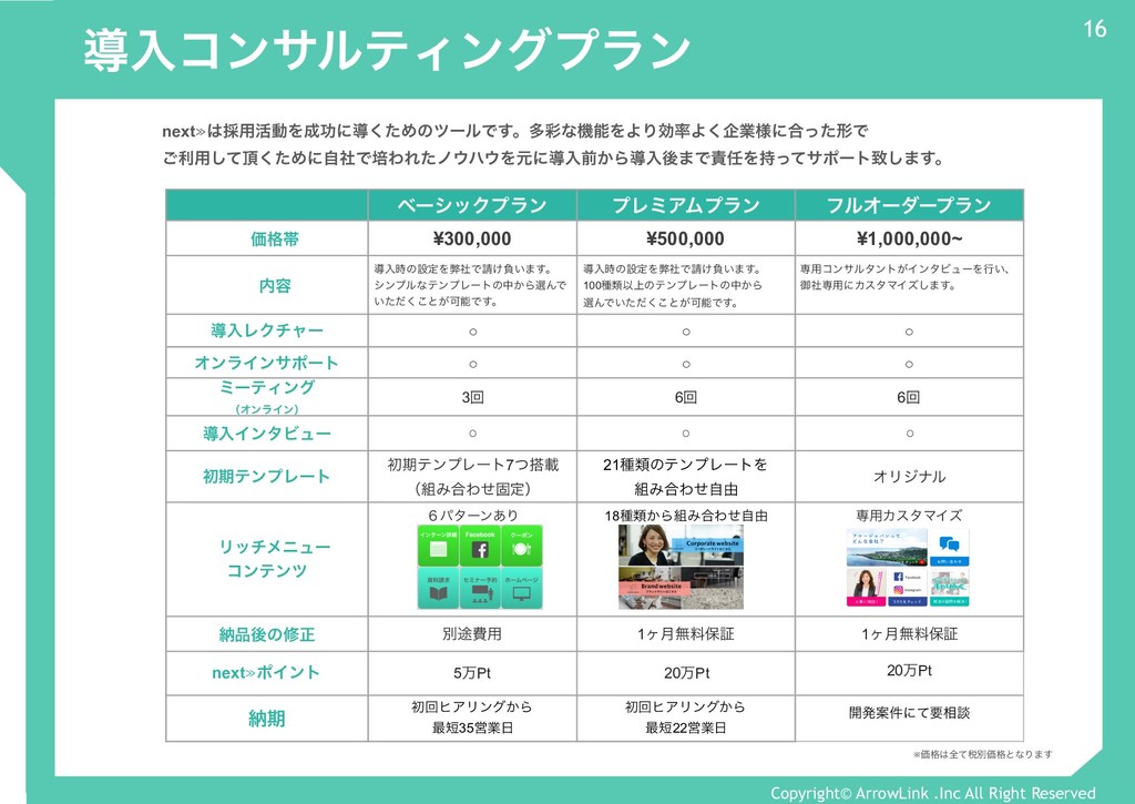 ϓϨϛΞϜϓϥϯ ϑϧΦʔμʔϓϥϯ ɹՁ֨ଳ ¥300,000 ¥500,000 ¥1,000,000~ ɹ༰ ಋೖ࣌ͷઃఆΛฐࣾͰ͚ෛ͍·͢ɻ γϯϓϧͳςϯϓϨʔτͷத͔ΒબΜͰ ͍ͨͩ͘͜ͱ͕ՄೳͰ͢ɻ ಋೖ࣌ͷઃఆΛฐࣾͰ͚ෛ͍·͢ɻ 100छྨҎ্ͷςϯϓϨʔτͷத͔Β બΜͰ͍ͨͩ͘͜ͱ͕ՄೳͰ͢ɻ ઐ༻ίϯαϧλϯτ͕ΠϯλϏϡʔΛߦ͍ɺ ޚࣾઐ༻ʹΧελϚΠζ͠·͢ɻ ಋೖϨΫνϟʔ ◦ ◦ ◦ ΦϯϥΠϯαϙʔτ ◦ ◦ ◦ ϛʔςΟϯά ʢΦϯϥΠϯʣ 3ճ 6ճ 6ճ ಋೖΠϯλϏϡʔ ◦ ◦ ◦ ॳظςϯϓϨʔτ ॳظςϯϓϨʔτ7ͭࡌ ʢΈ߹Θͤݻఆʣ 21छྨͷςϯϓϨʔτΛ Έ߹Θͤࣗ༝ ΦϦδφϧ ɹϦονϝχϡʔ ίϯςϯπ ̒ύλʔϯ͋Γ 18छྨ͔ΒΈ߹Θͤࣗ༝ ઐ༻ΧελϚΠζ ೲޙͷमਖ਼ ผ్අ༻ 1ϲ݄ແྉอূ 1ϲ݄ແྉอূ next≫ϙΠϯτ 5ສPt 20ສPt 20ສPt ೲظ ॳճώΞϦϯά͔Β ࠷35Ӧۀ ॳճώΞϦϯά͔Β ࠷22Ӧۀ ։ൃҊ݅ʹͯཁ૬ஊ next≫࠾༻׆ಈΛޭʹಋͨ͘ΊͷπʔϧͰ͢ɻଟ࠼ͳػೳΛΑΓޮΑ͘اۀ༷ʹ߹ͬͨܗͰ