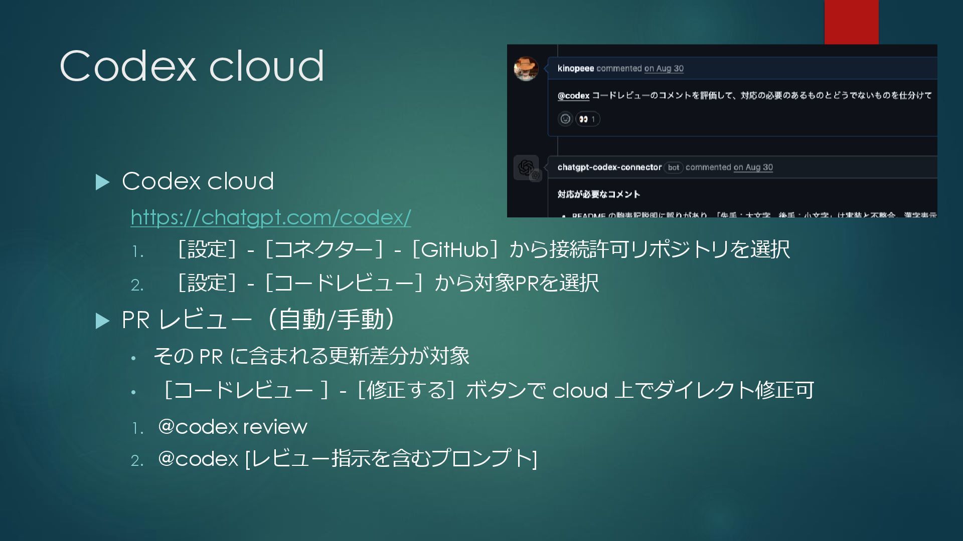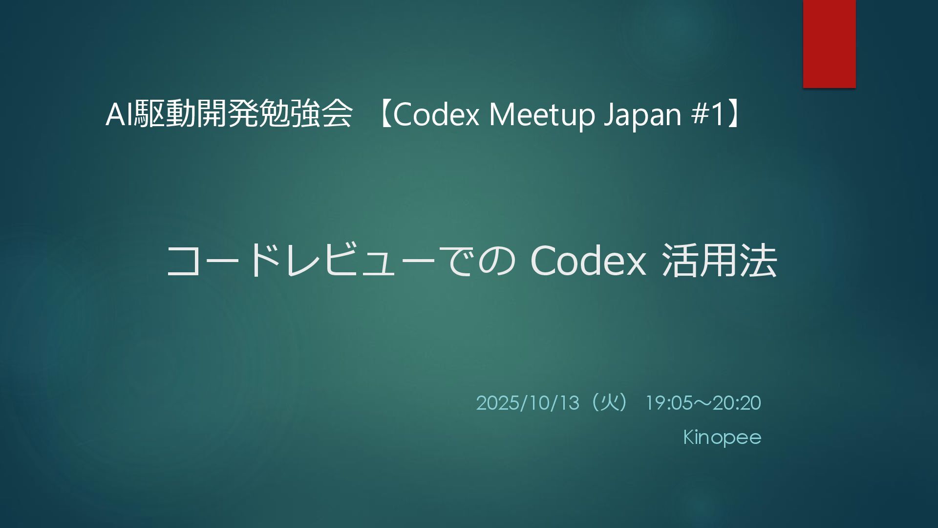 コードレビューでの Codex 活用法 2025/10/13(火) 19:05〜20:20 Kinopee AI駆動開発勉強会 【Codex Meetup Japan
