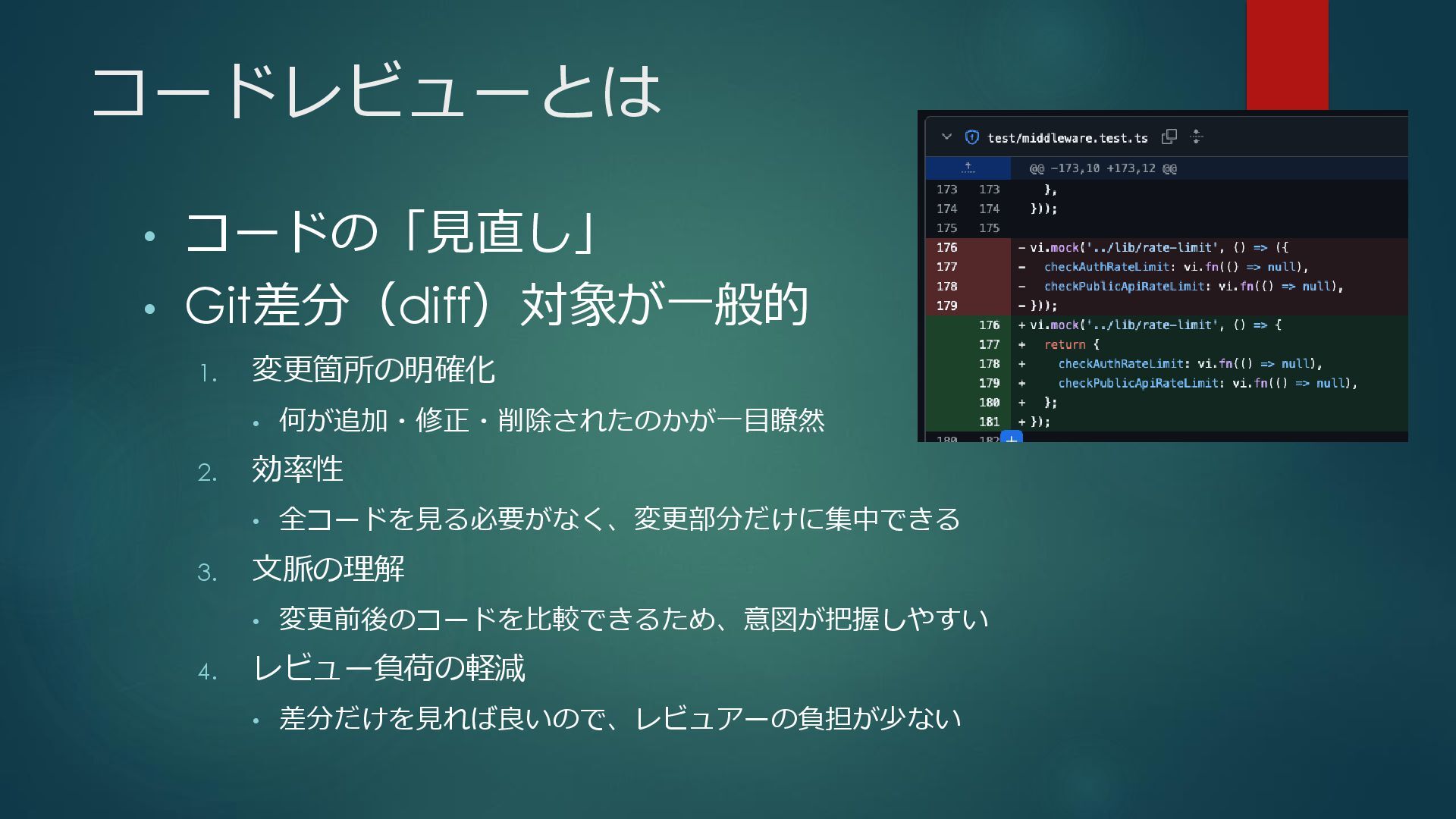 効率性 • 全コードを見る必要がなく、変更部分だけに集中できる 3. 文脈の理解 • 変更前後のコードを比較できるため、意図が把握しやすい 4. レビュー負荷の軽減 • 差分だけを見れば良いので、レビュアーの負担が少ない