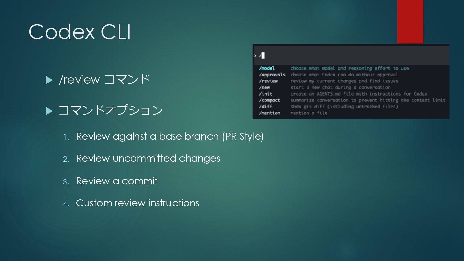 Codex CLI /review コマンド コマンドオプション 1. Review against