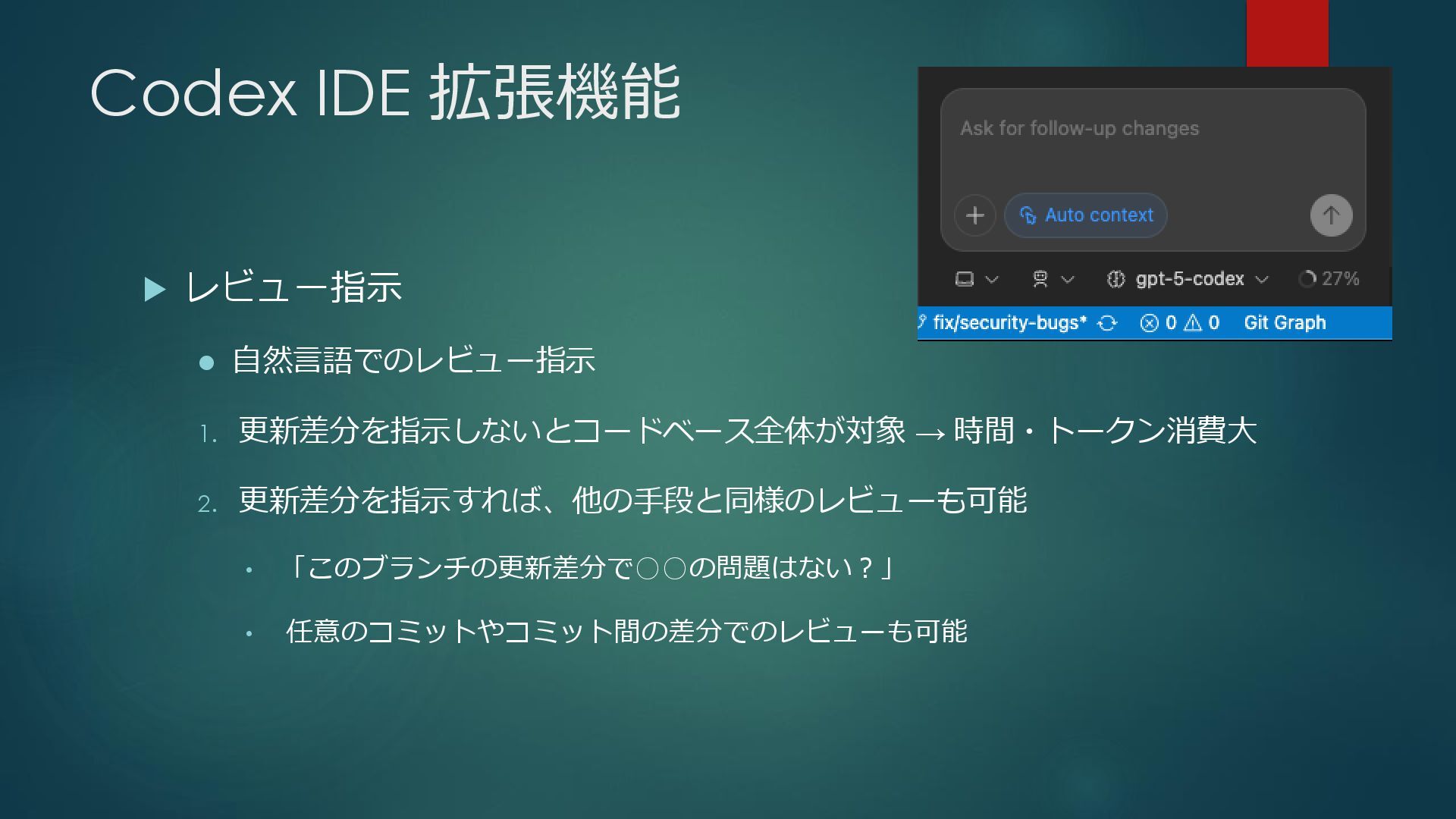 Codex IDE 拡張機能 レビュー指示 ⚫ 自然言語でのレビュー指示 1. 更新差分を指示しないとコードベース全体が対象 →
