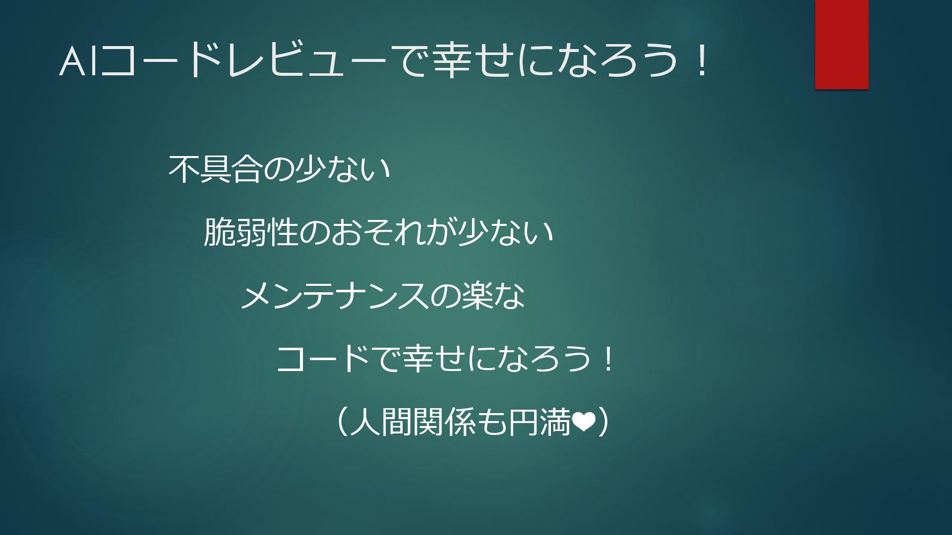 AIコードレビューで幸せになろう! 不具合の少ない 脆弱性のおそれが少ない メンテナンスの楽な コードで幸せになろう! (人間関係も円満 )