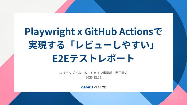 1 Playwright x GitHub Actionsで 実現する「レビューしやすい」 E2Eテストレポート ロリポップ‧ムームードメイン事業部 ⻄⽥貴之 2025.12.06