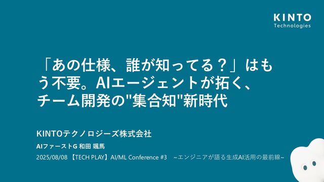 「あの仕様、誰が知ってる?」はも う不要。AIエージェントが拓く、 チーム開発の"集合知"新時代 KINTOテクノロジーズ株式会社 AIファーストG 和田 颯馬 2025/08/08 【TECH PLAY】AI/ML