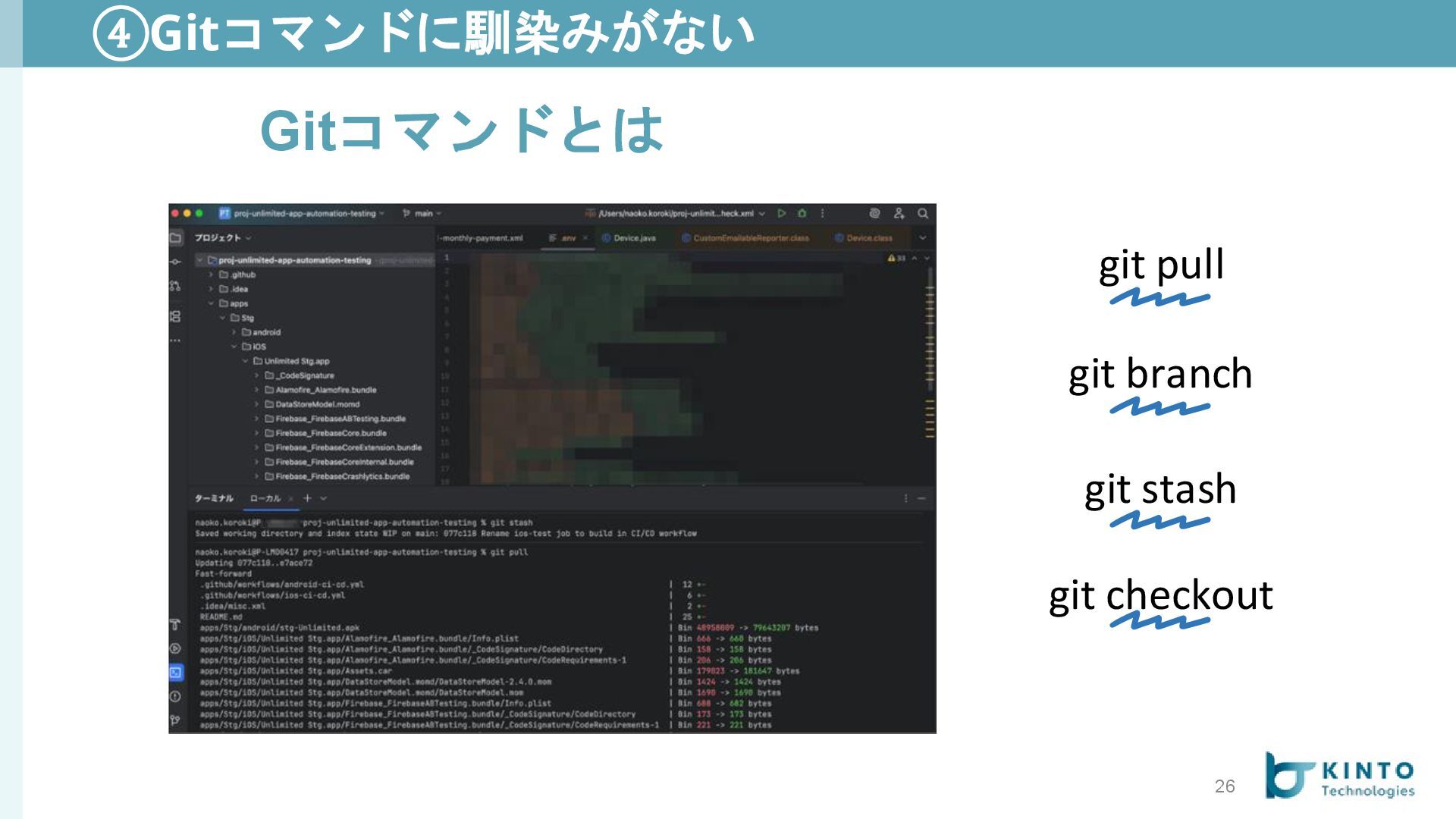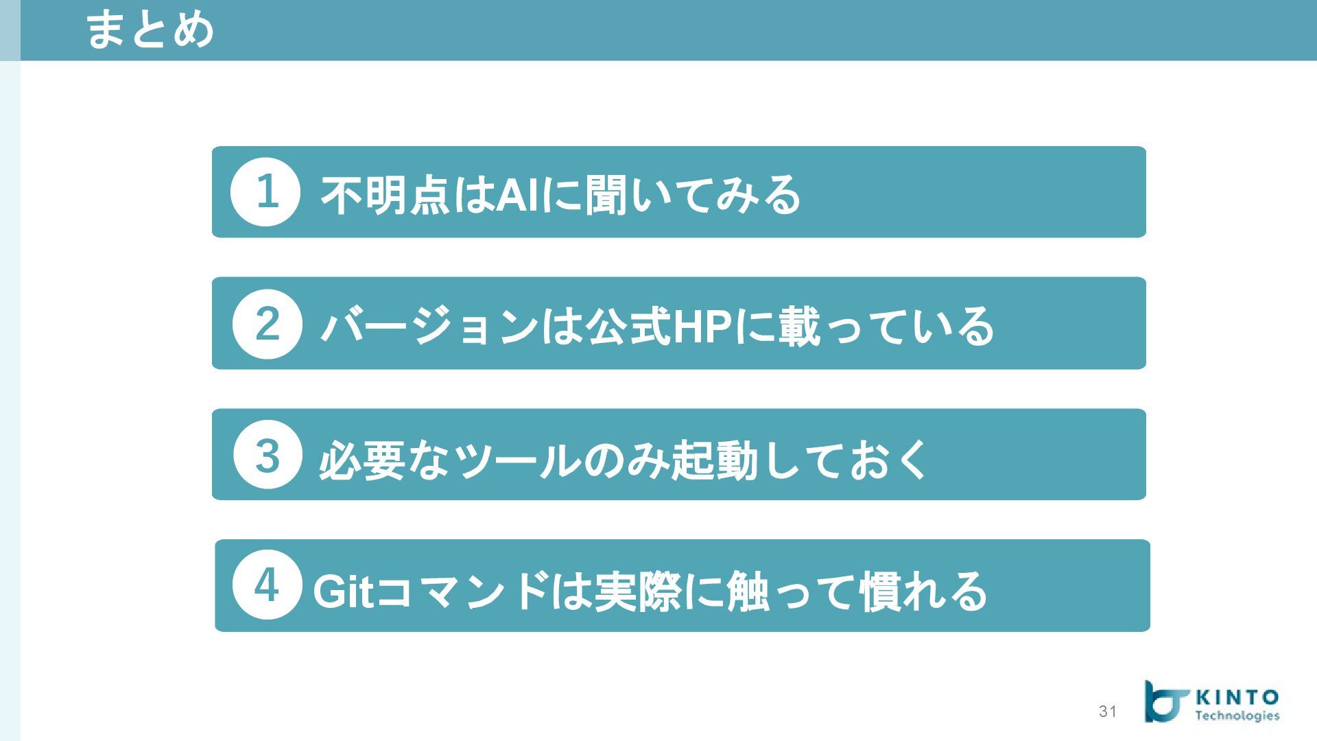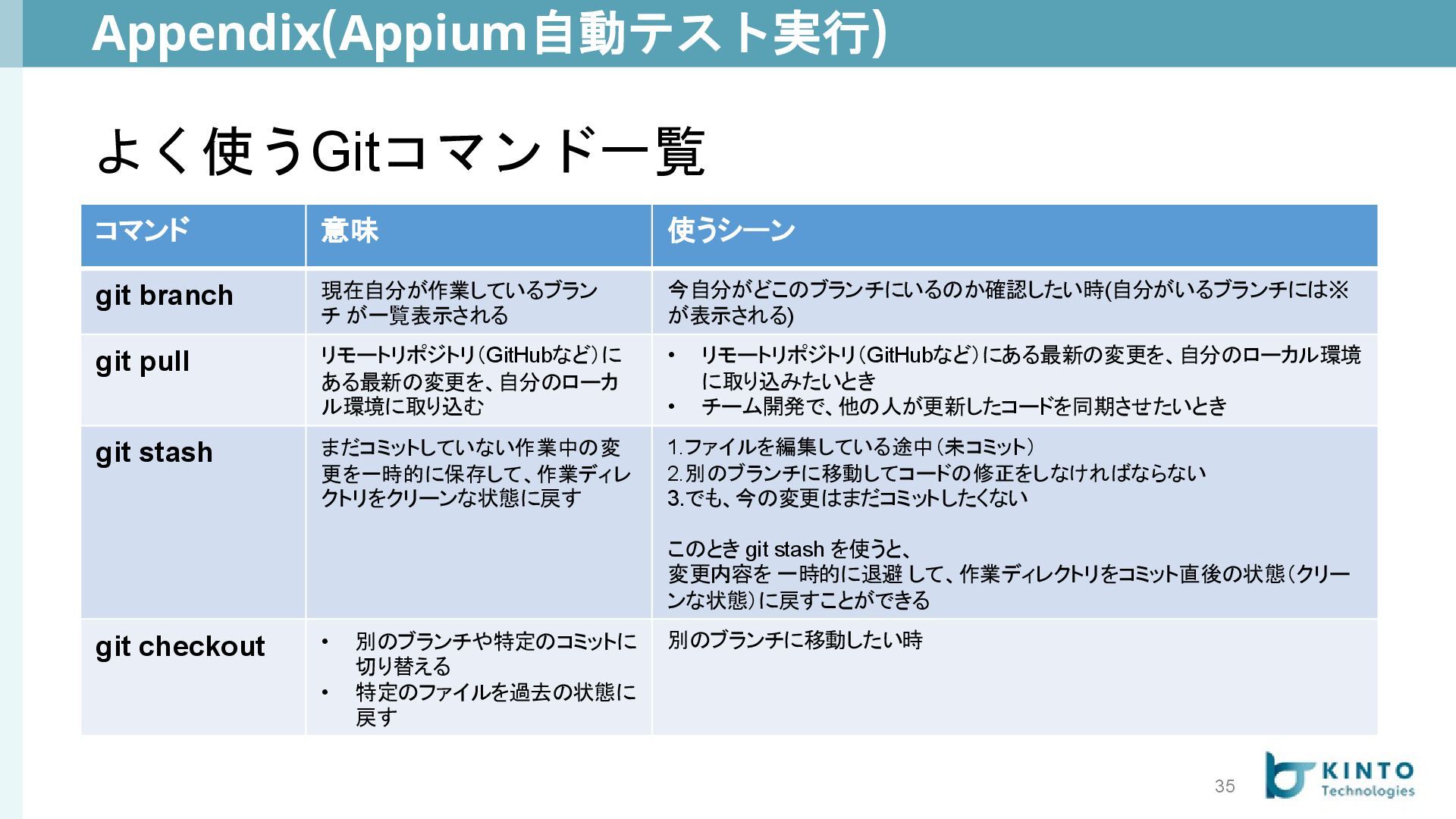 チ が一覧表示される 今自分がどこのブランチにいるのか確認したい時(自分がいるブランチには※ が表示される) git pull リモートリポジトリ(GitHubなど)に ある最新の変更を、自分のローカ ル環境に取り込む • リモートリポジトリ(GitHubなど)にある最新の変更を、自分のローカル環境 に取り込みたいとき • チーム開発で、他の人が更新したコードを同期させたいとき git stash まだコミットしていない作業中の変 更を一時的に保存して、作業ディレ クトリをクリーンな状態に戻す 1.ファイルを編集している途中(未コミット) 2.別のブランチに移動してコードの修正をしなければならない 3.でも、今の変更はまだコミットしたくない このとき git stash を使うと、 変更内容を 一時的に退避 して、作業ディレクトリをコミット直後の状態(クリー ンな状態)に戻すことができる git checkout • 別のブランチや特定のコミットに 切り替える • 特定のファイルを過去の状態に 戻す 別のブランチに移動したい時