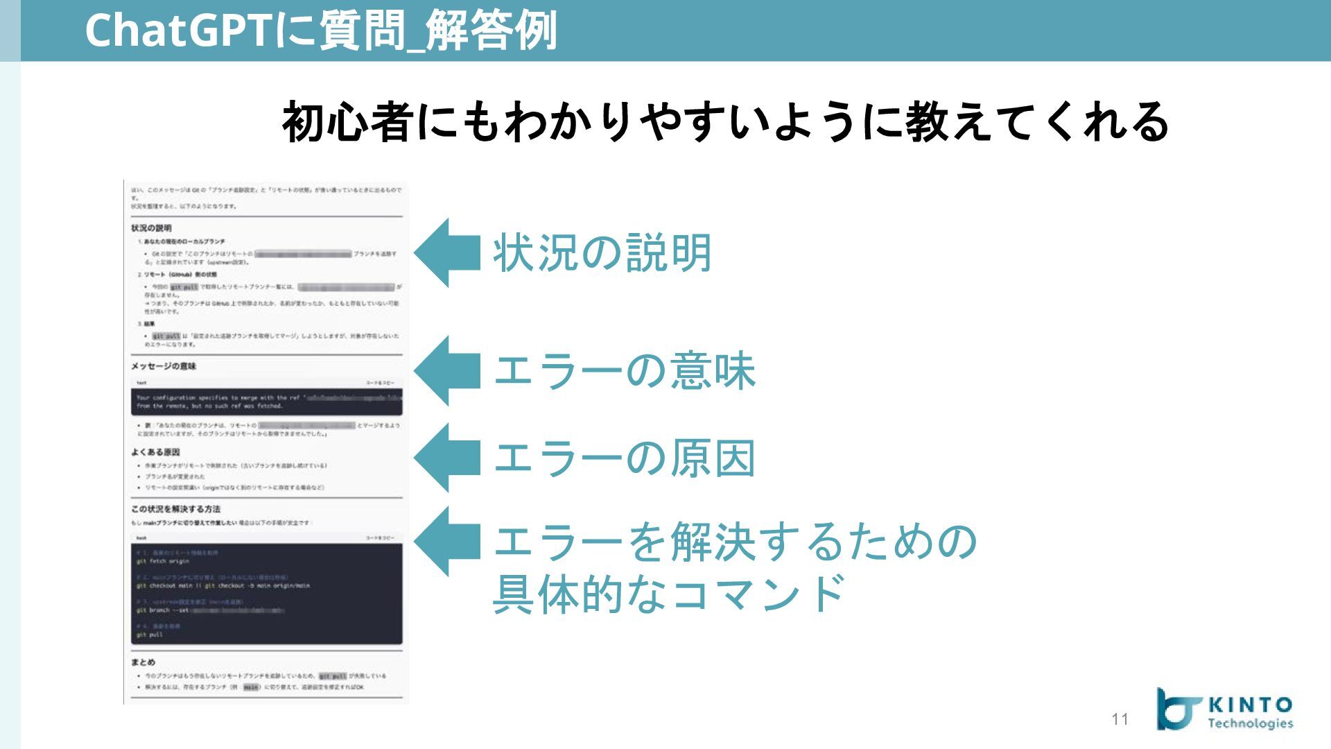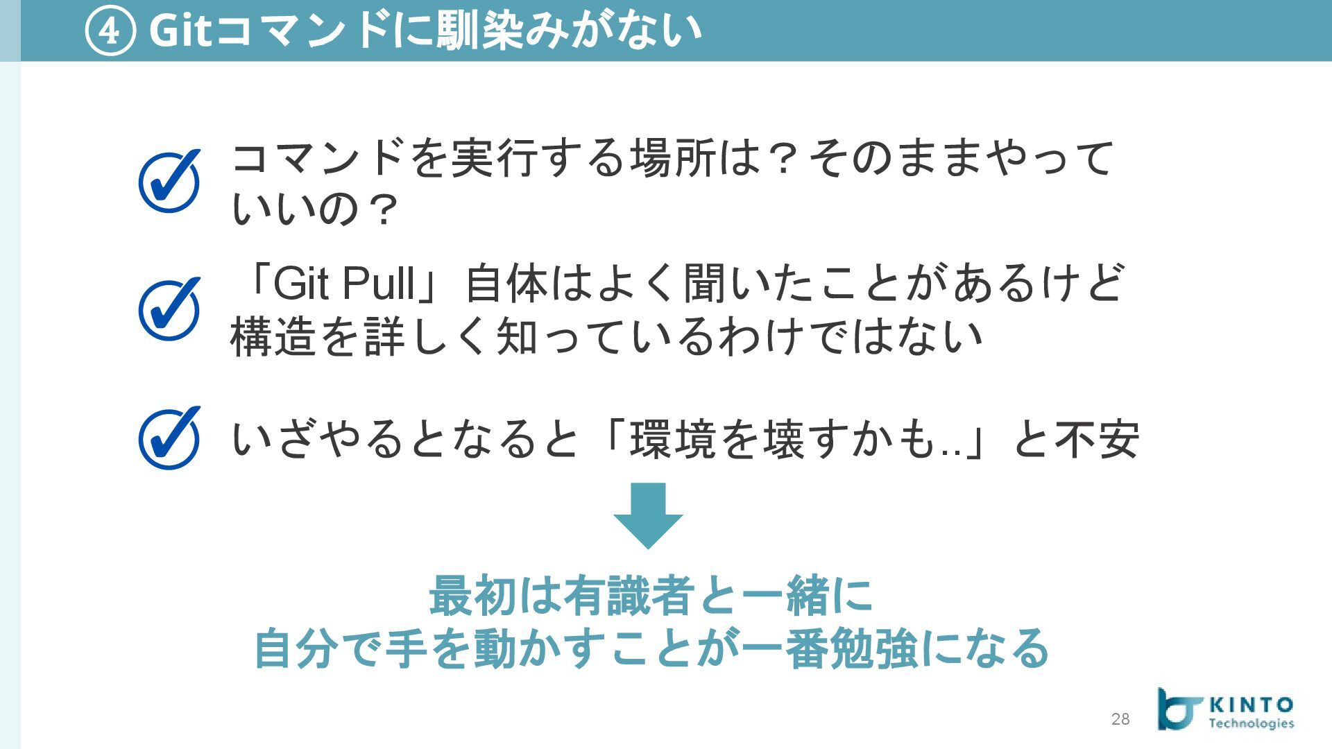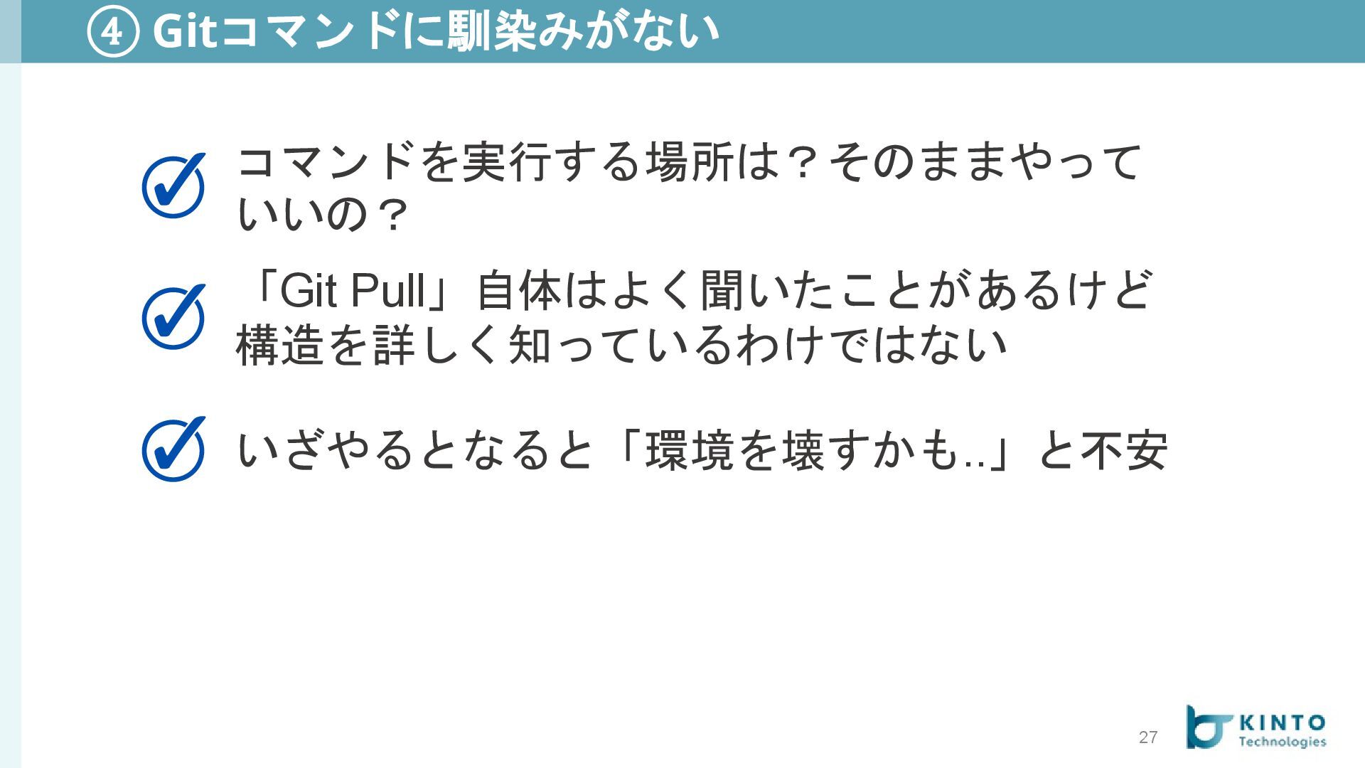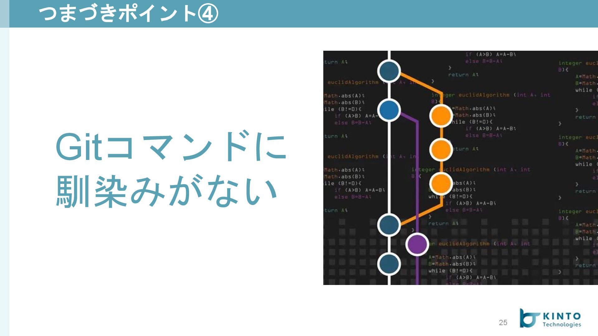 チ が一覧表示される 今自分がどこのブランチにいるのか確認したい時(自分がいるブランチには※ が表示される) git pull リモートリポジトリ(GitHubなど)に ある最新の変更を、自分のローカ ル環境に取り込む • リモートリポジトリ(GitHubなど)にある最新の変更を、自分のローカル環境 に取り込みたいとき • チーム開発で、他の人が更新したコードを同期させたいとき git stash まだコミットしていない作業中の変 更を一時的に保存して、作業ディレ クトリをクリーンな状態に戻す 1.ファイルを編集している途中(未コミット) 2.別のブランチに移動してコードの修正をしなければならない 3.でも、今の変更はまだコミットしたくない このとき git stash を使うと、 変更内容を 一時的に退避 して、作業ディレクトリをコミット直後の状態(クリー ンな状態)に戻すことができる git checkout • 別のブランチや特定のコミットに 切り替える • 特定のファイルを過去の状態に 戻す 別のブランチに移動したい時
