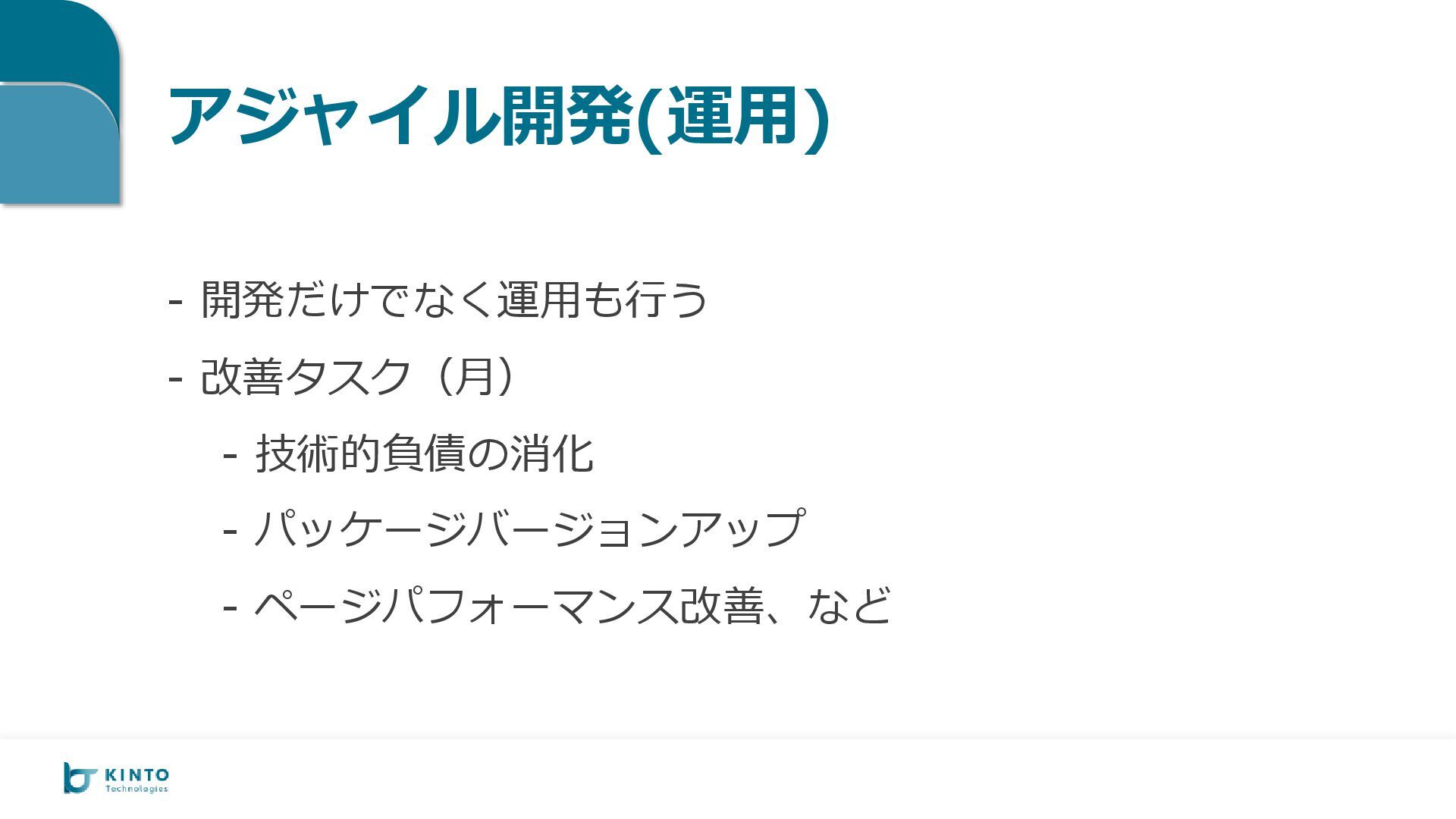 アジャイル開発(運用) - 開発だけでなく運用も行う - 改善タスク(月) - 技術的負債の消化 - パッケージバージョンアップ -