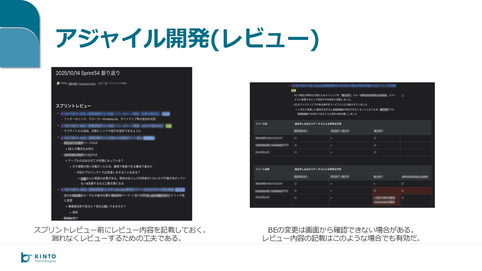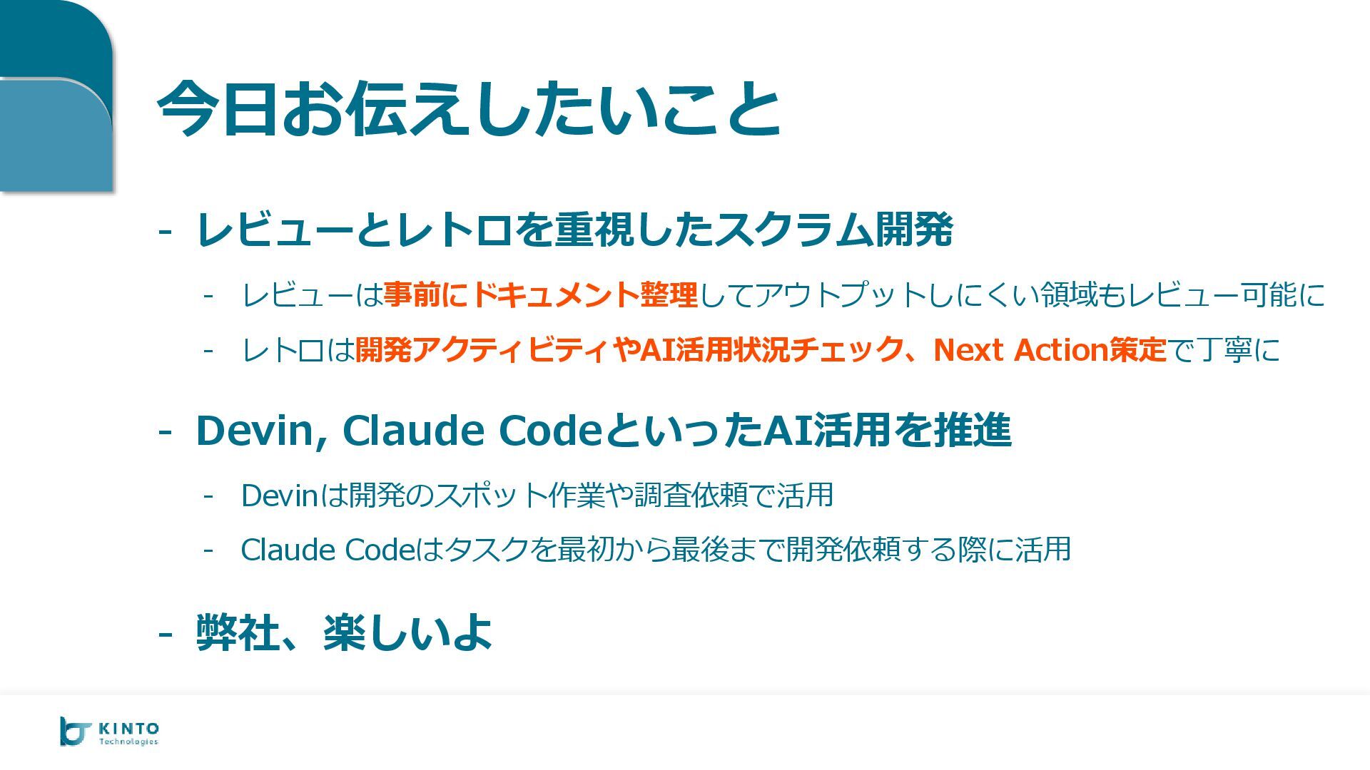 - レビューとレトロを重視したスクラム開発 - レビューは事前にドキュメント整理してアウトプットしにくい領域もレビュー可能に - レトロは開発アクティビティやAI活用状況チェック、Next Action策定で丁寧に - Devin, Claude