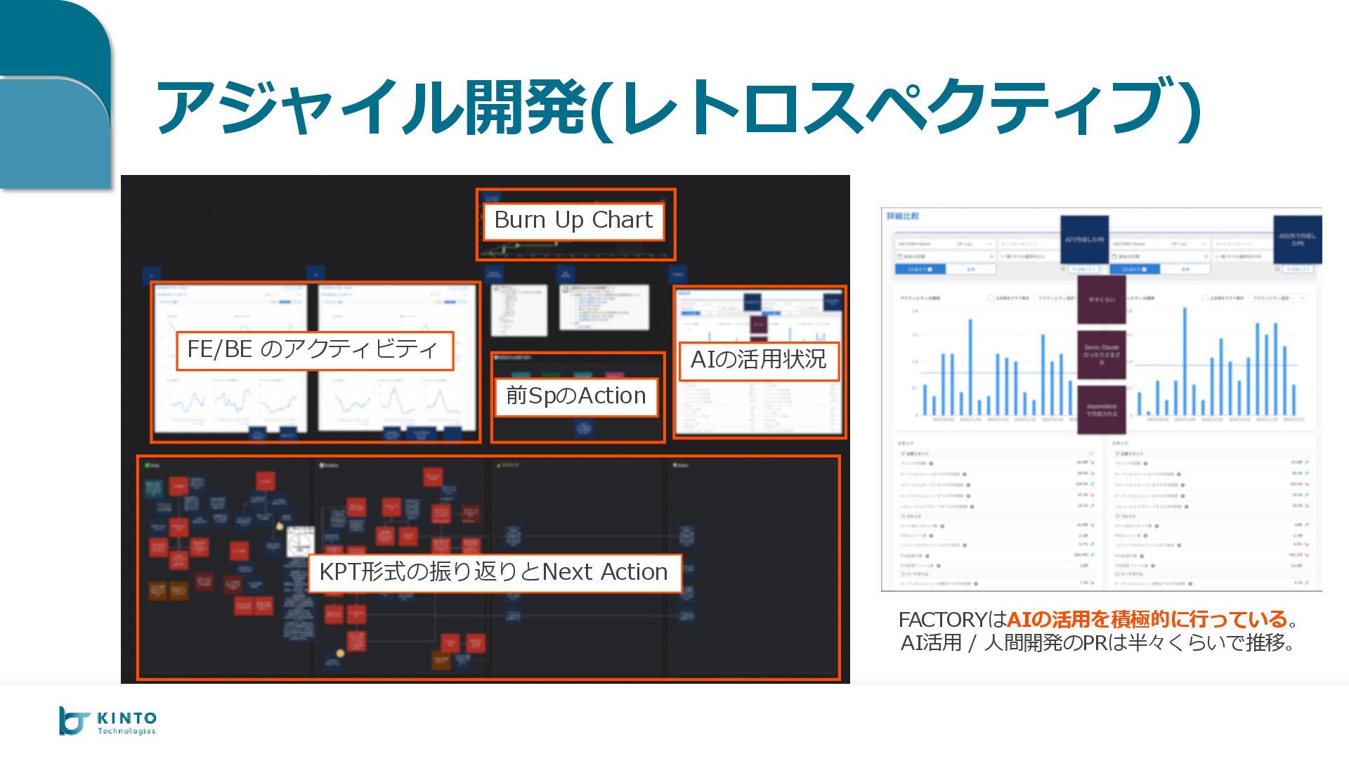 アジャイル開発(レトロスペクティブ) KPT形式の振り返りとNext Action FE/BE のアクティビティ Burn Up Chart 前SpのAction AIの活用状況