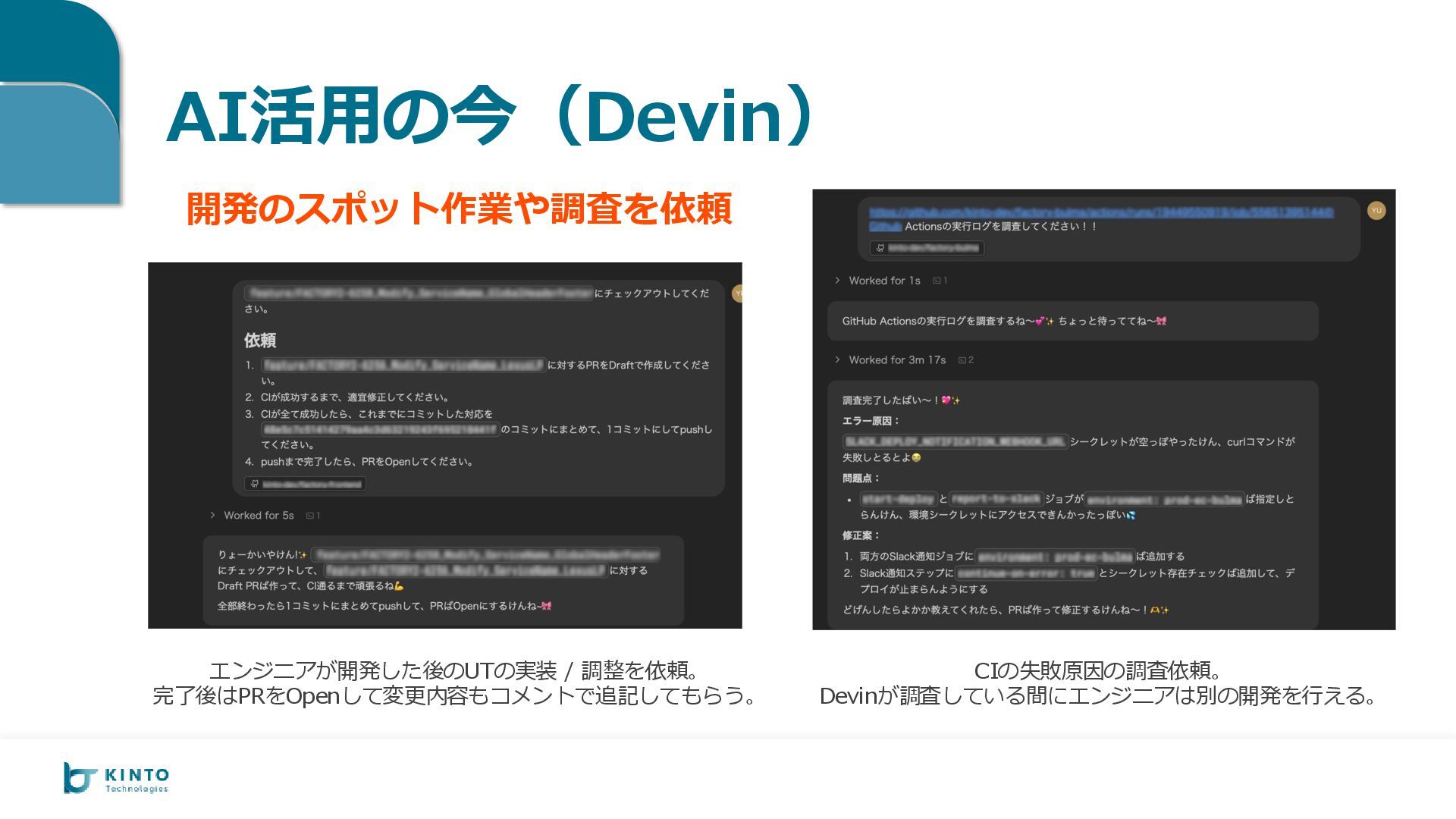 AI活用の今(Devin) エンジニアが開発した後のUTの実装 / 調整を依頼。 完了後はPRをOpenして変更内容もコメントで追記してもらう。 CIの失敗原因の調査依頼。 Devinが調査している間にエンジニアは別の開発を行える。 開発のスポット作業や調査を依頼
