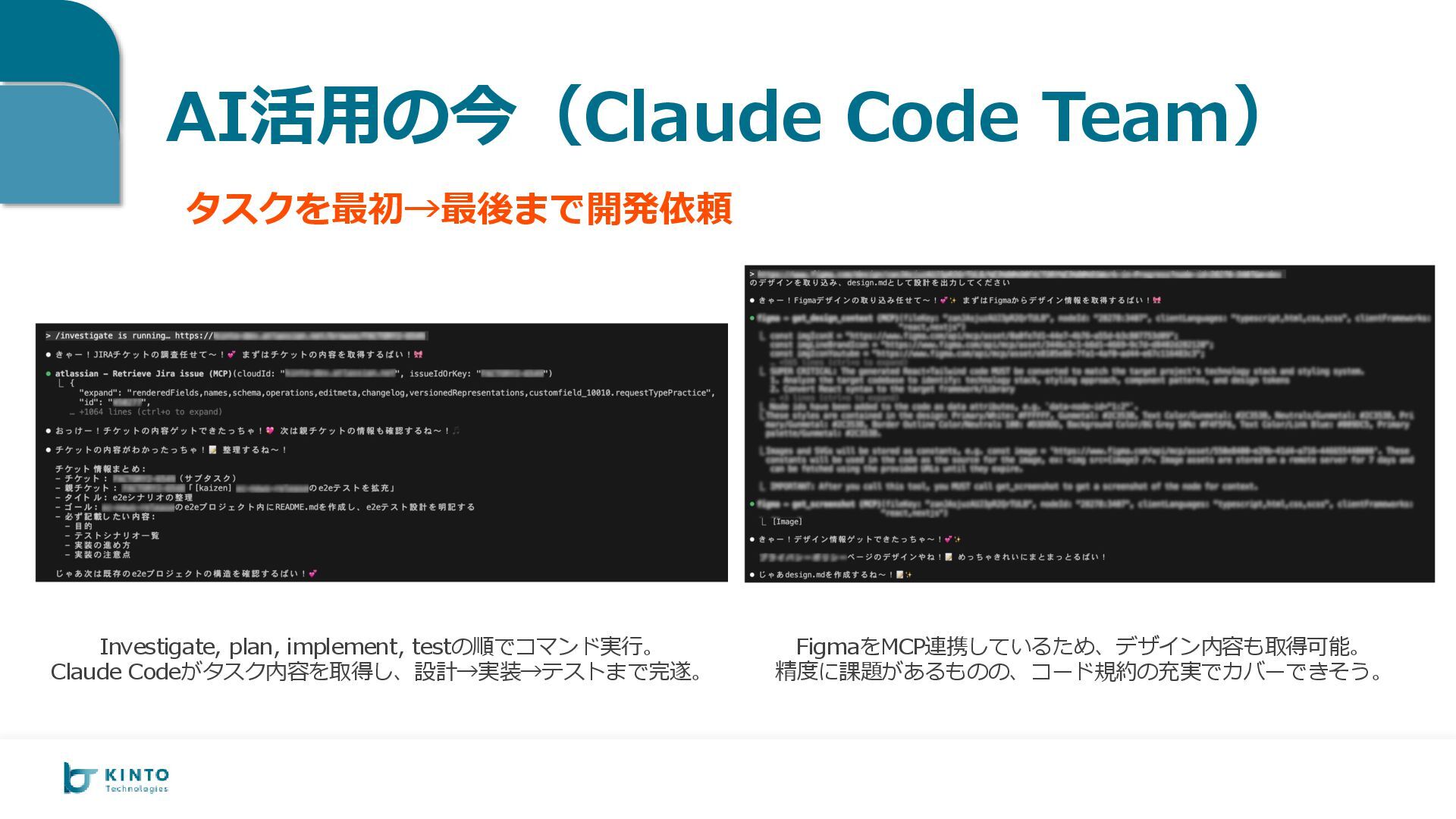 AI活用の今(Claude Code Team) タスクを最初→最後まで開発依頼 Investigate, plan, implement, testの順でコマンド実行。 Claude Codeがタスク内容を取得し、設計→実装→テストまで完遂。