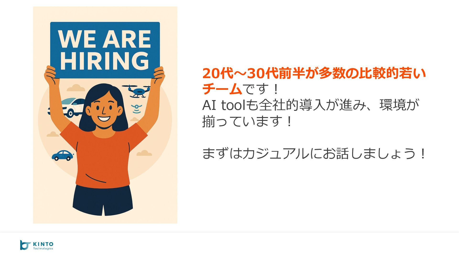 20代〜30代前半が多数の比較的若い チームです! AI toolも全社的導入が進み、環境が 揃っています! まずはカジュアルにお話しましょう!