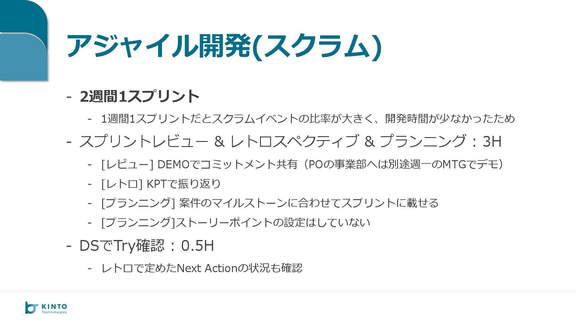 プランニング : 3H - [レビュー] DEMOでコミットメント共有(POの事業部へは別途週一のMTGでデモ) - [レトロ] KPTで振り返り - [プランニング] 案件のマイルストーンに合わせてスプリントに載せる - [プランニング]ストーリーポイントの設定はしていない - DSでTry確認 : 0.5H - レトロで定めたNext Actionの状況も確認