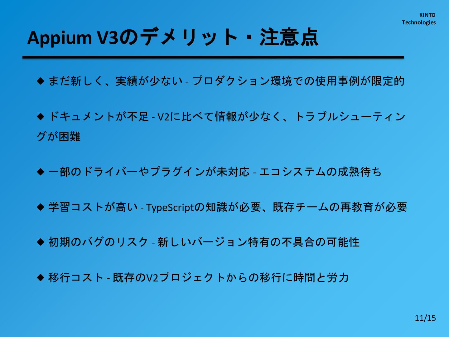 KINTO Technologies Appium V3のデメリット・注意点 ◆ まだ新しく、実績が少ない - プロダクション環境での使用事例が限定的 ◆ ドキュメントが不足