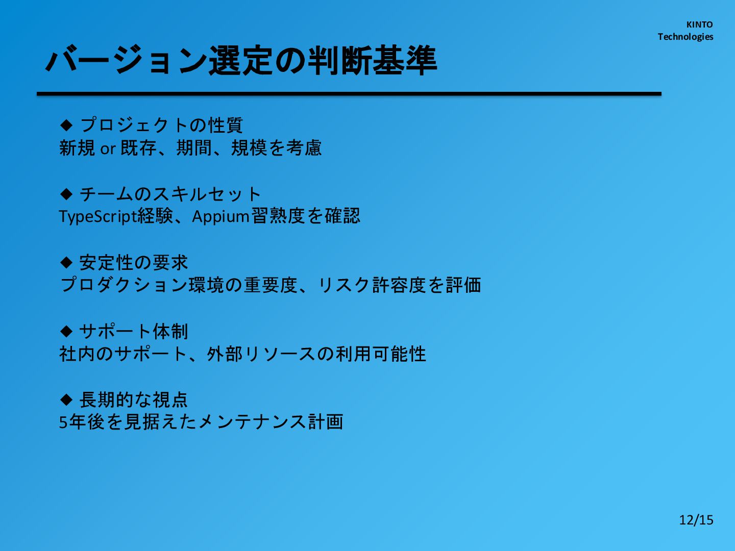TypeScript経験、Appium習熟度を確認 ◆ 安定性の要求 プロダクション環境の重要度、リスク許容度を評価 ◆ サポート体制 社内のサポート、外部リソースの利用可能性 ◆ 長期的な視点 5年後を見据えたメンテナンス計画 12/15